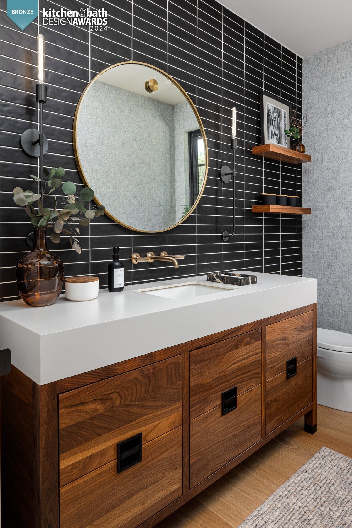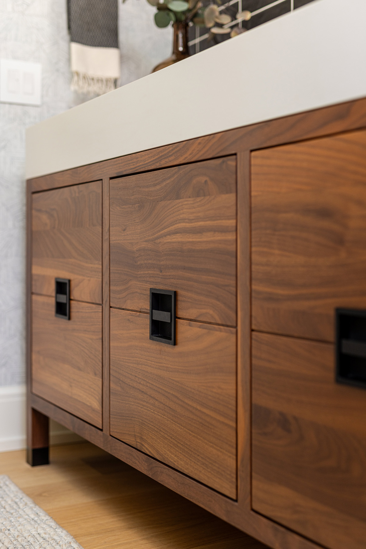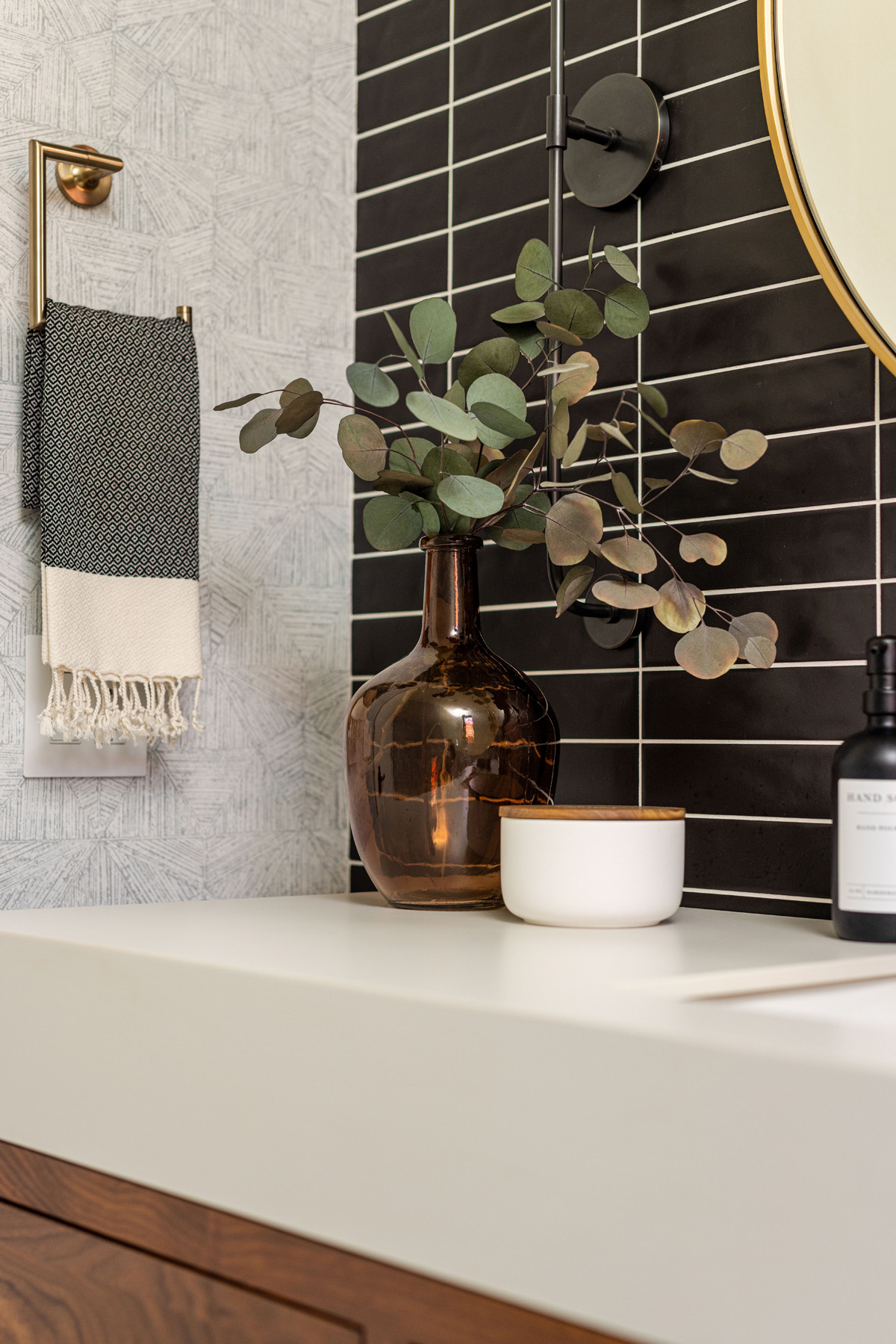 A wide-ranging palette of natural neutrals was selected to match the homeowners’ tastes, including walnut, warm whites and black marble. The clients were highly selective and had a very clear vision of the vibe they wanted, and this is reflected in this powder room’s selections. A rich walnut vanity by Emery Design | Build combined with sleek black CIOT wall tile and Thibaut wallpaper creates a natural yet bold feel, accented with warm metals. Thoughtful vanity storage and shelving ensure that the space is as functional as it is beautiful.