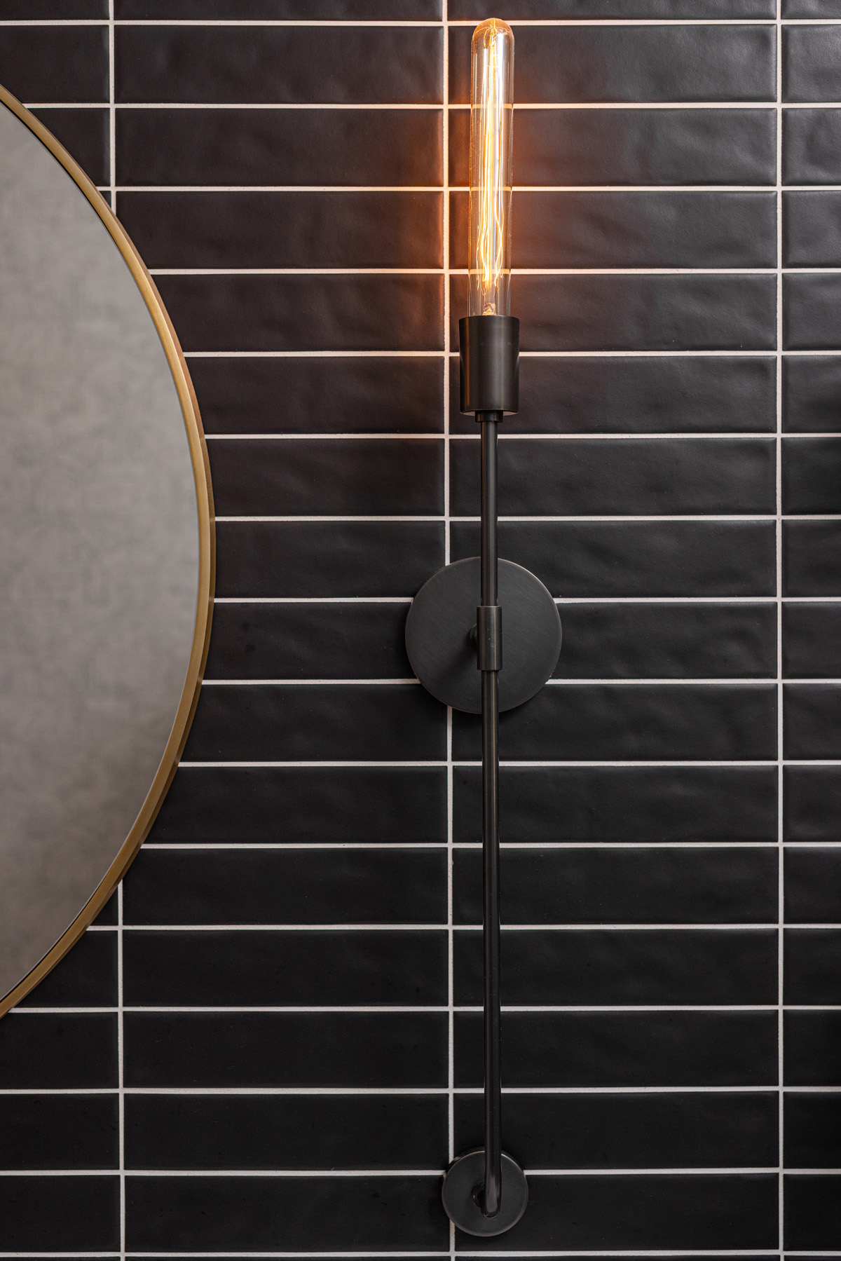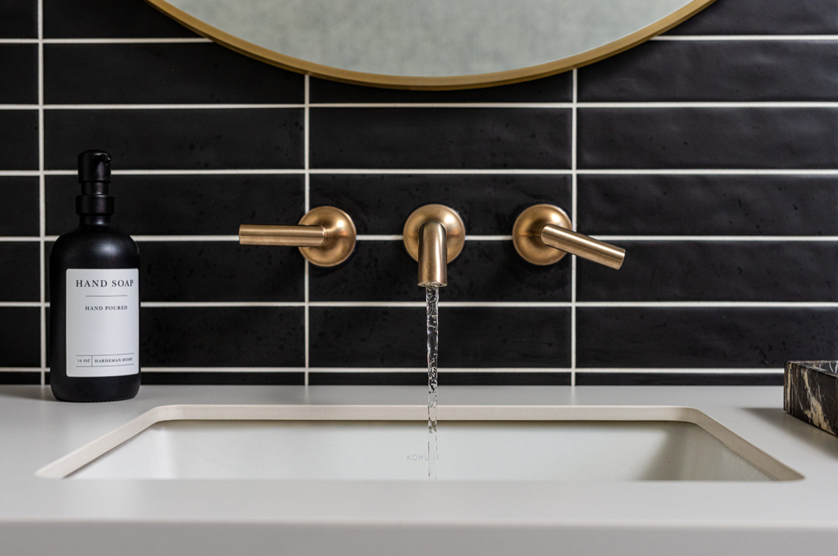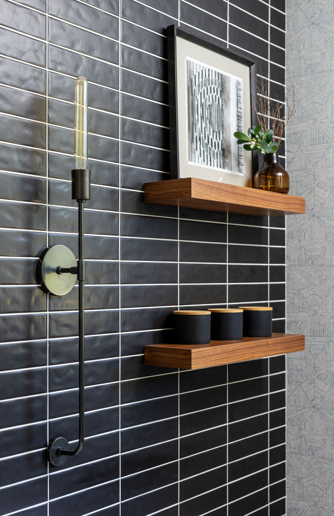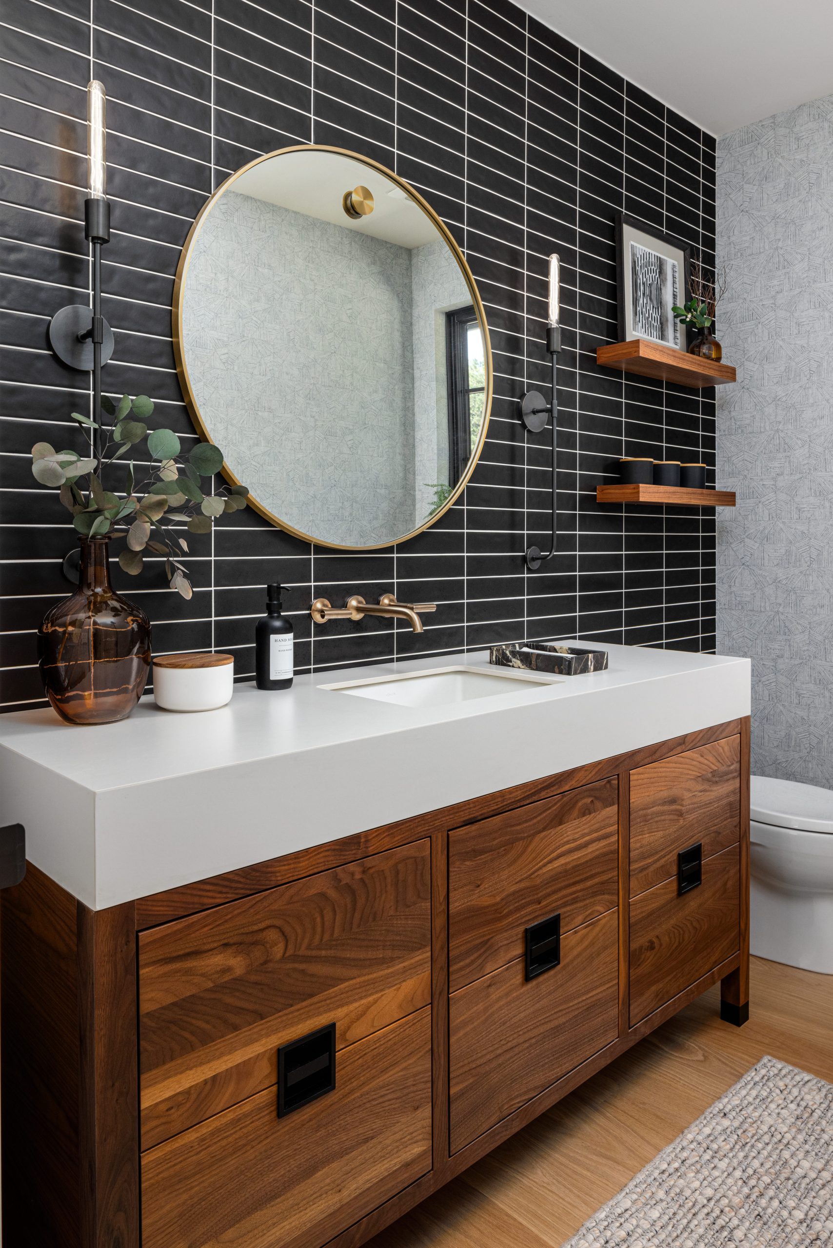 A wide-ranging palette of natural neutrals was selected to match the homeowners’ tastes, including walnut, warm whites and black marble. The clients were highly selective and had a very clear vision of the vibe they wanted, and this is reflected in this powder room’s selections. A rich walnut vanity by Emery Design | Build combined with sleek black CIOT wall tile and Thibaut wallpaper creates a natural yet bold feel, accented with warm metals. Thoughtful vanity storage and shelving ensure that the space is as functional as it is beautiful.