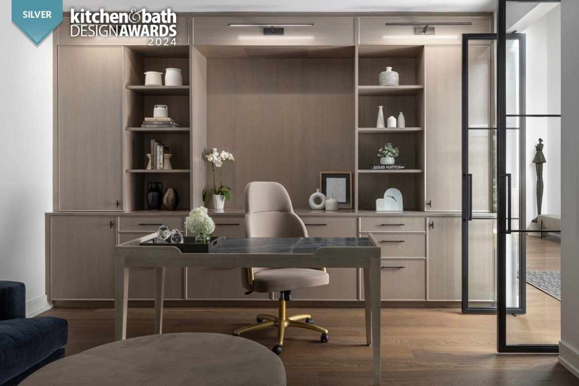 The desire for a decorative but functional home office that also had an area for lounging was the task for Kasoff and Holdan, who worked with Nosan Signature Homes on this project. The relatively small room needed to include an ottoman, sectional or chaise and wall-mounted television, with a work space that provided a display area for artwork and sculptures, as well as room for a printer and large number of paper files.