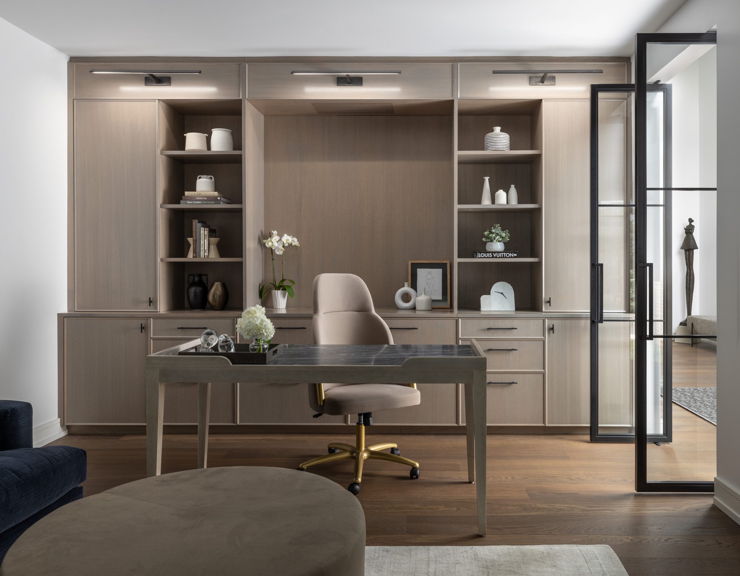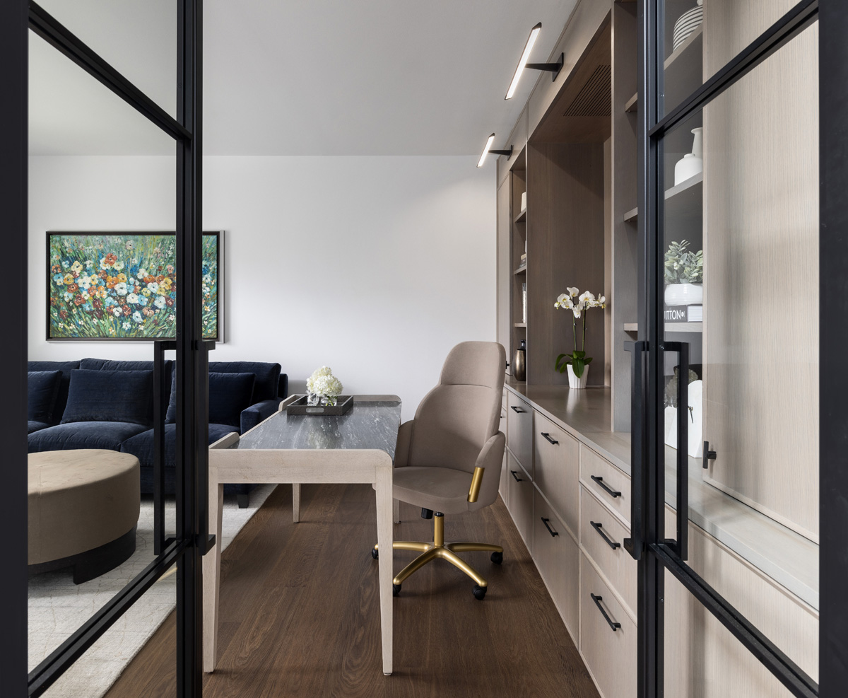 Privacy came in the way of Weldworks custom glass doors with black iron, which allowed for shutting out the world when work and conference calls were happening. A custom built-in wall unit using Conestoga Wood’s Aspen door style in white rift cut oak along the back wall included hanging file storage, electrical outlets within the closed cabinets, Schaub & Co. Quadrato matte black knobs and pulls, and ample storage. The large central panel remained open to serve as a backdrop for custom artwork. In addition, large linear picture lights from Visual Comfort are installed in the upper portion of the unit to provide ambient lighting.