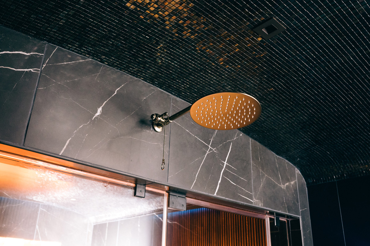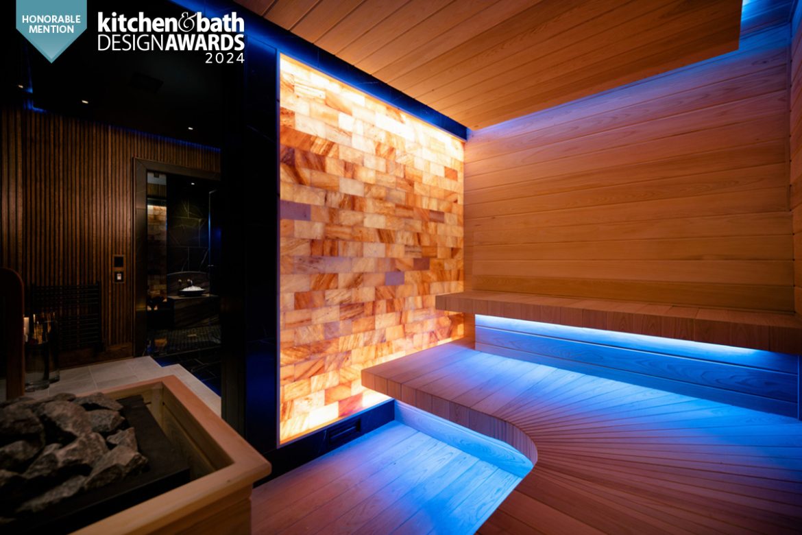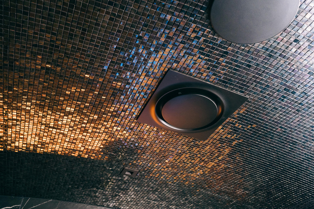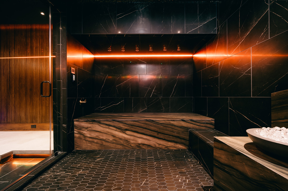 The designer doubled the size of the steam room and added a digitally controlled Vichy shower experience with Kohler DTV+ Digital Shower Interface Control Panel, where the user lays down in the shower under multiple heads. A pull-chain cold plunge was added to prevent overheating. The room has Brizo voice-activated Mystix steam controls, Kohler Sound Tile Shower Speakers and Aero Pure ceiling- mount ventilation as well as a Native Trails Morro 17″ circular concrete vessel cold sink in Slate for ice. Tile here includes Daltile Marble Attache Nero Linear Hexagon on the floor and Medici & Co. Glamour Collection Metal Fused Glass Mosaic in Gingham on the ceiling.