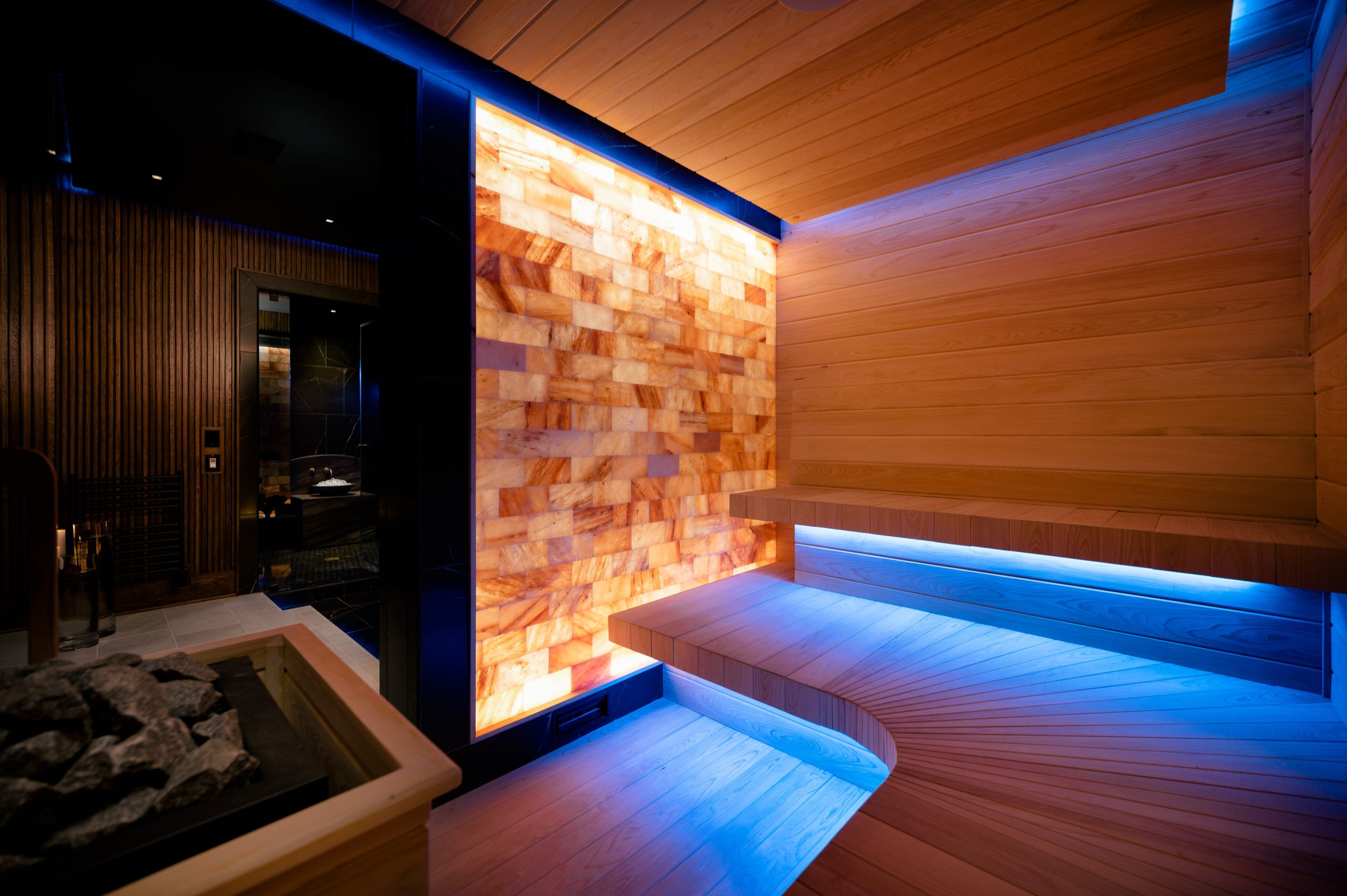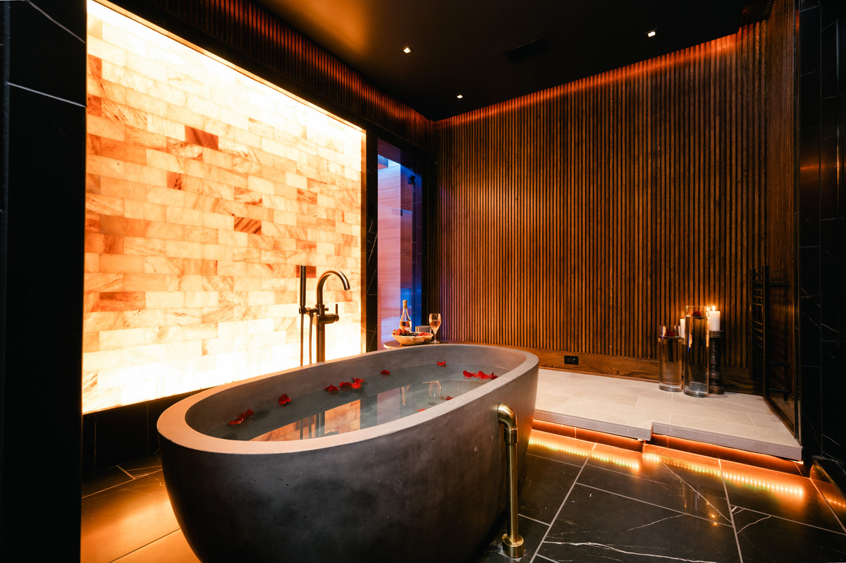This 6,000-sq.-ft. basement required a full renovation due to flood damage. The original space included a small home spa, and the homeowner took the opportunity to reimagine the space, requesting a spa area that could make a statement yet still tie into the existing home.
