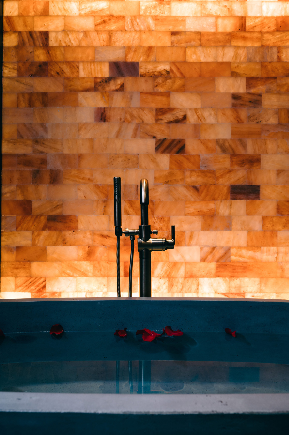 An Avalon soaking tub in Slate from Native Trails, paired with a Delta Faucet Trinsic floor mount tub filler, sits in front of a salt wall fashioned from Himalayan Pink Salt Bricks. A bath area includes a custom vanity with Sequoia brown leathered marble and bar pulls from Top Knobs. The Montecito rectangular concrete drop-in sink in Slate is from Native Trails, matched with Delta Faucet Trinsic Wall Mounted faucet in Champagne Bronze. A toilet is also featured here.