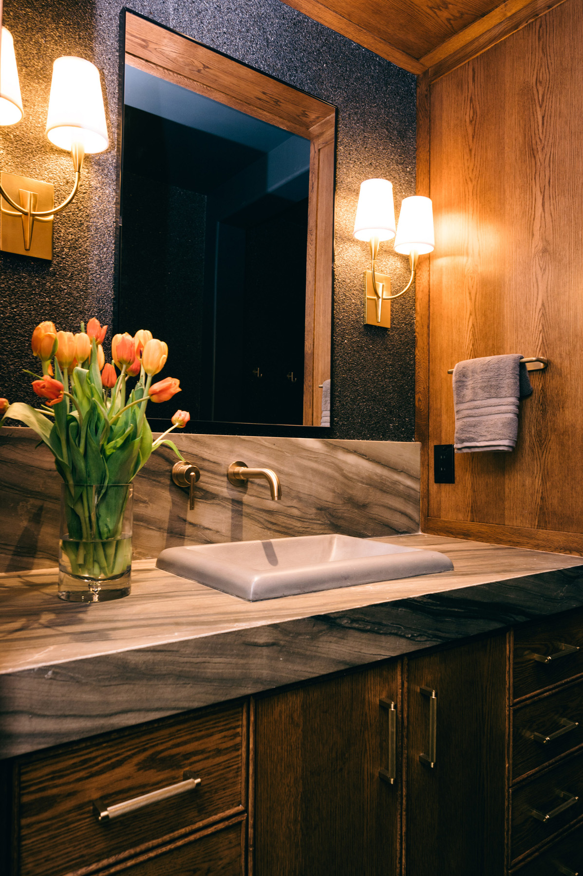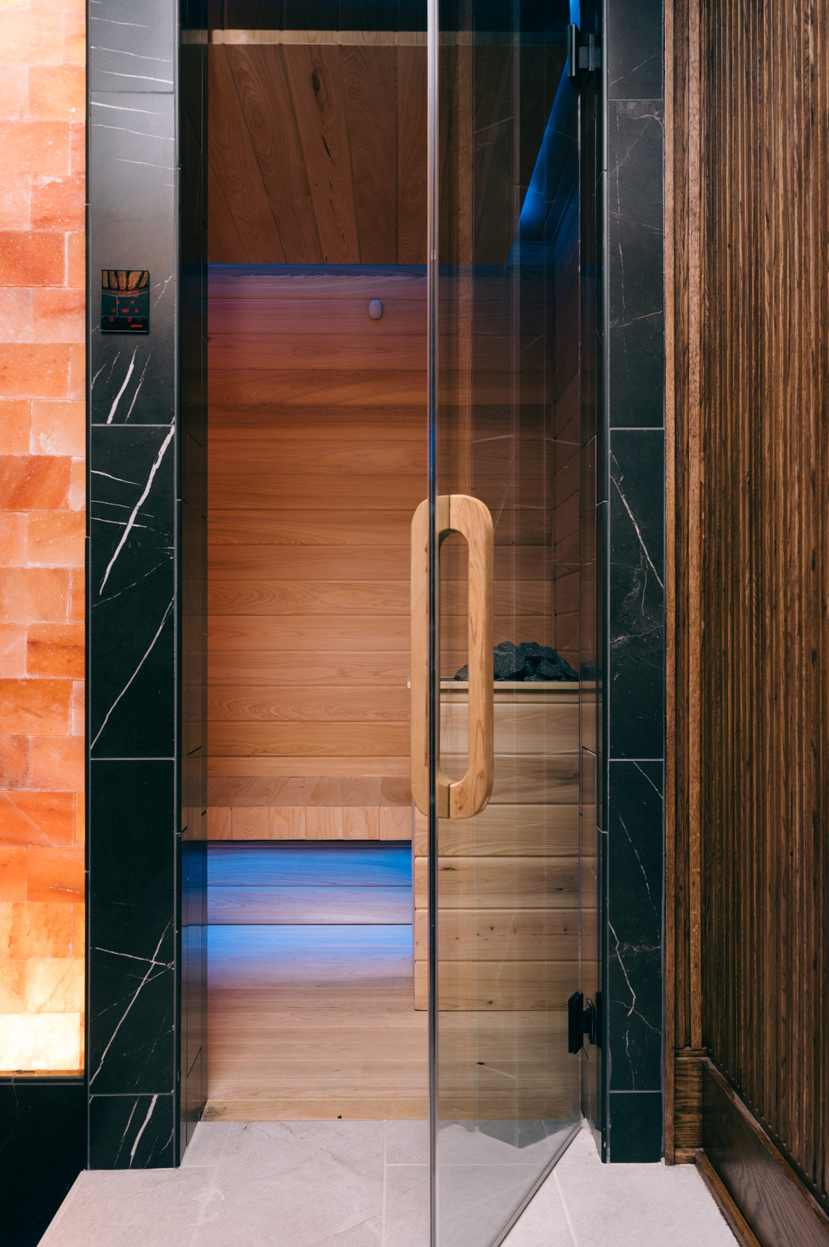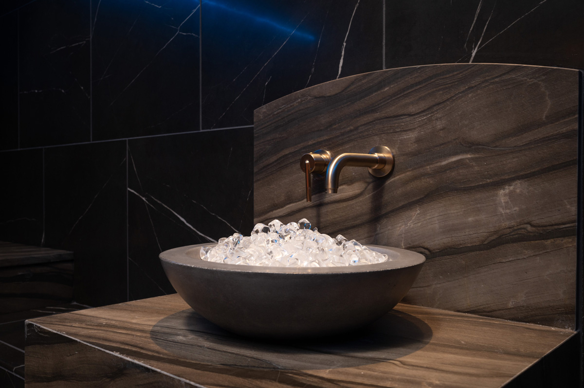 Completing the space is a large sauna room with speakers and a refreshment bar for cold water and towels, warmed on a Jeeves oil rubbed bronze towel warmer from Amba Products.