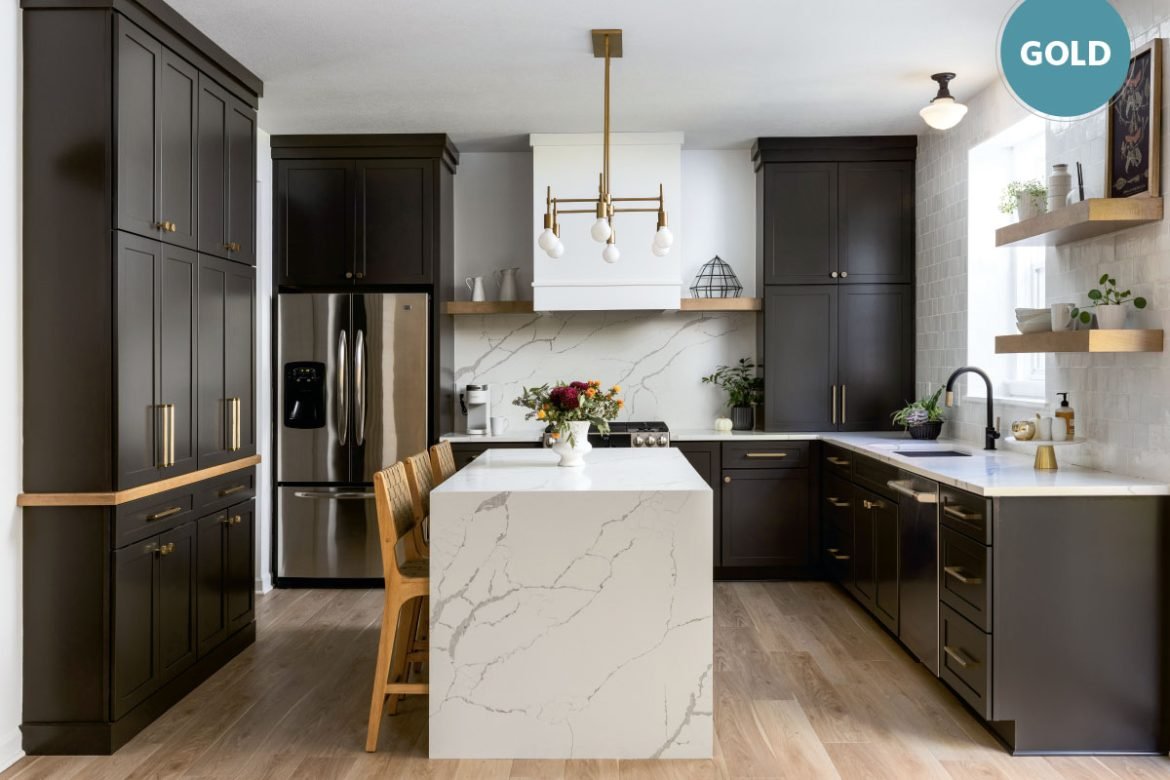 Creating a more functional, updated, but not-too-trendy kitchen – and one that was not white – was the primary objective for designer Jeanine Yancy when she remodeled this 190-sq.-ft. kitchen, which she worked on with John Scheel of Haven Construction in South Lyon, MI. The in-depth project involved a full gut renovation, including all new cabinets, countertops, flooring throughout the first floor and fixtures. It also required that some appliances be relocated. The design was based on a combination of the client’s inspiration images, her family’s needs and the parameters of the space.