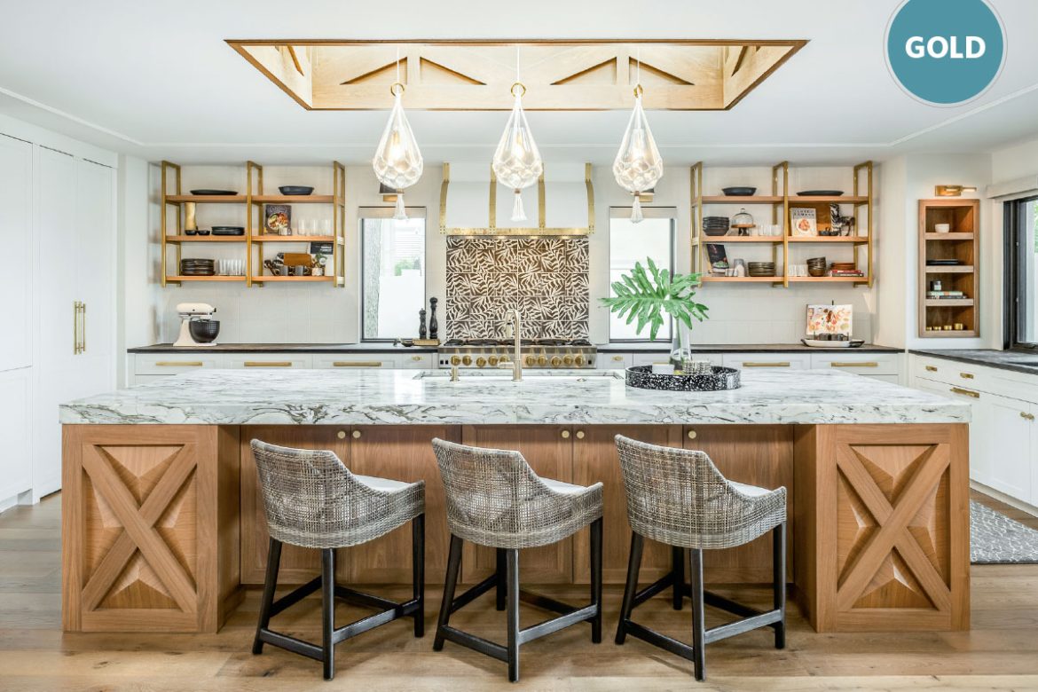 Custom cabinetry from T2theS is featured throughout, with Matrix 3D granite contrasting with the painted white cabinets on the perimeter. Superlative leathered quartzite highlights the maple cabinet tones on the island. Armac Martin MIX hardware in a golden hue adds warmth to the space.