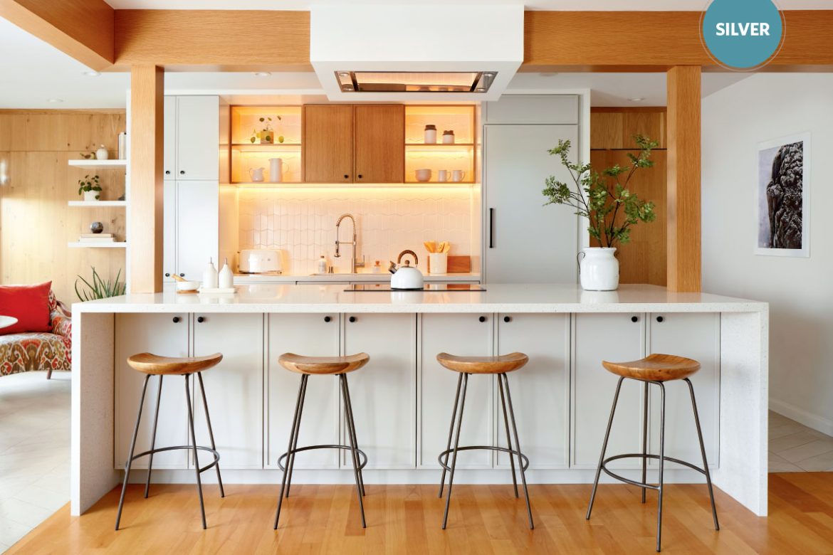 Removal of a wall between the kitchen and living room allowed for more natural light; it was replaced with a large island. A PSL beam was installed for structural integrity and became a bold architectural feature wrapped with premium-grade rift oak veneer.