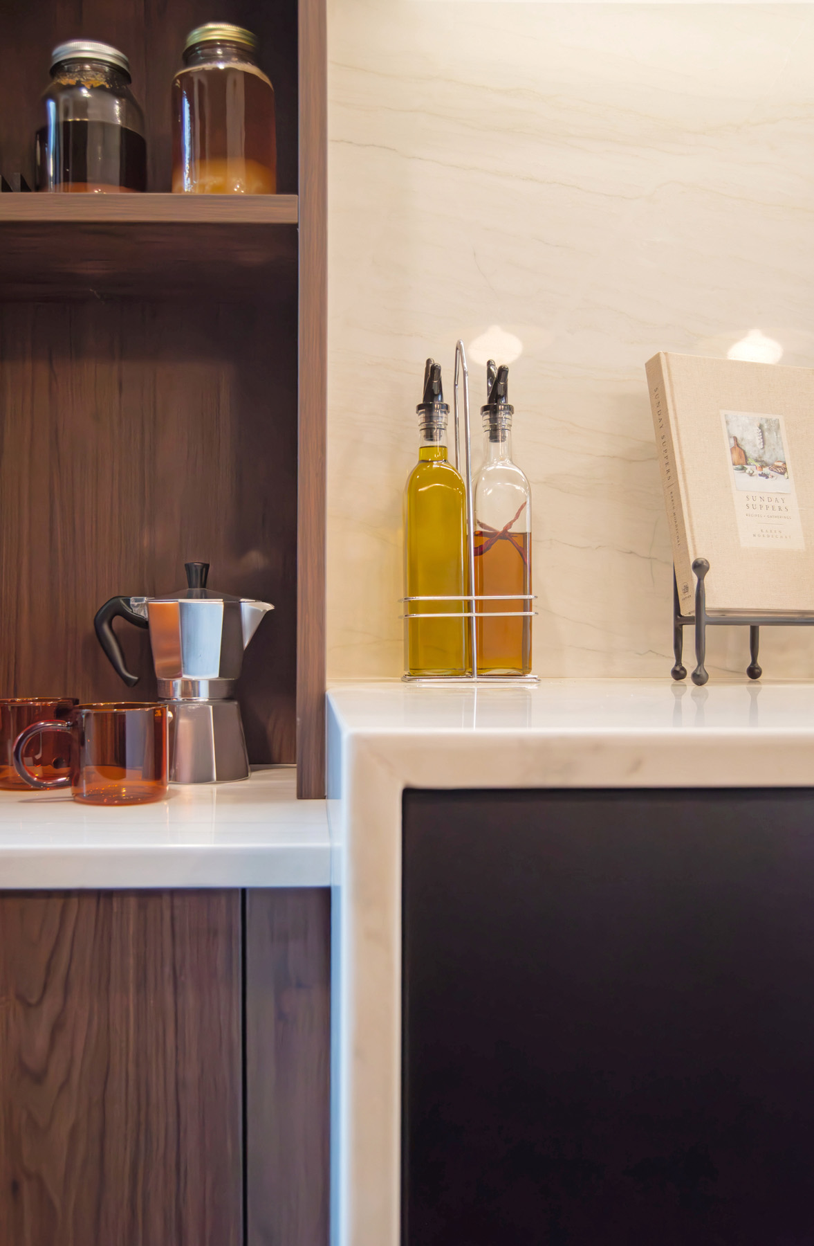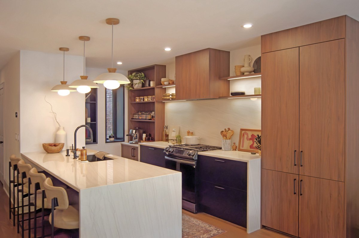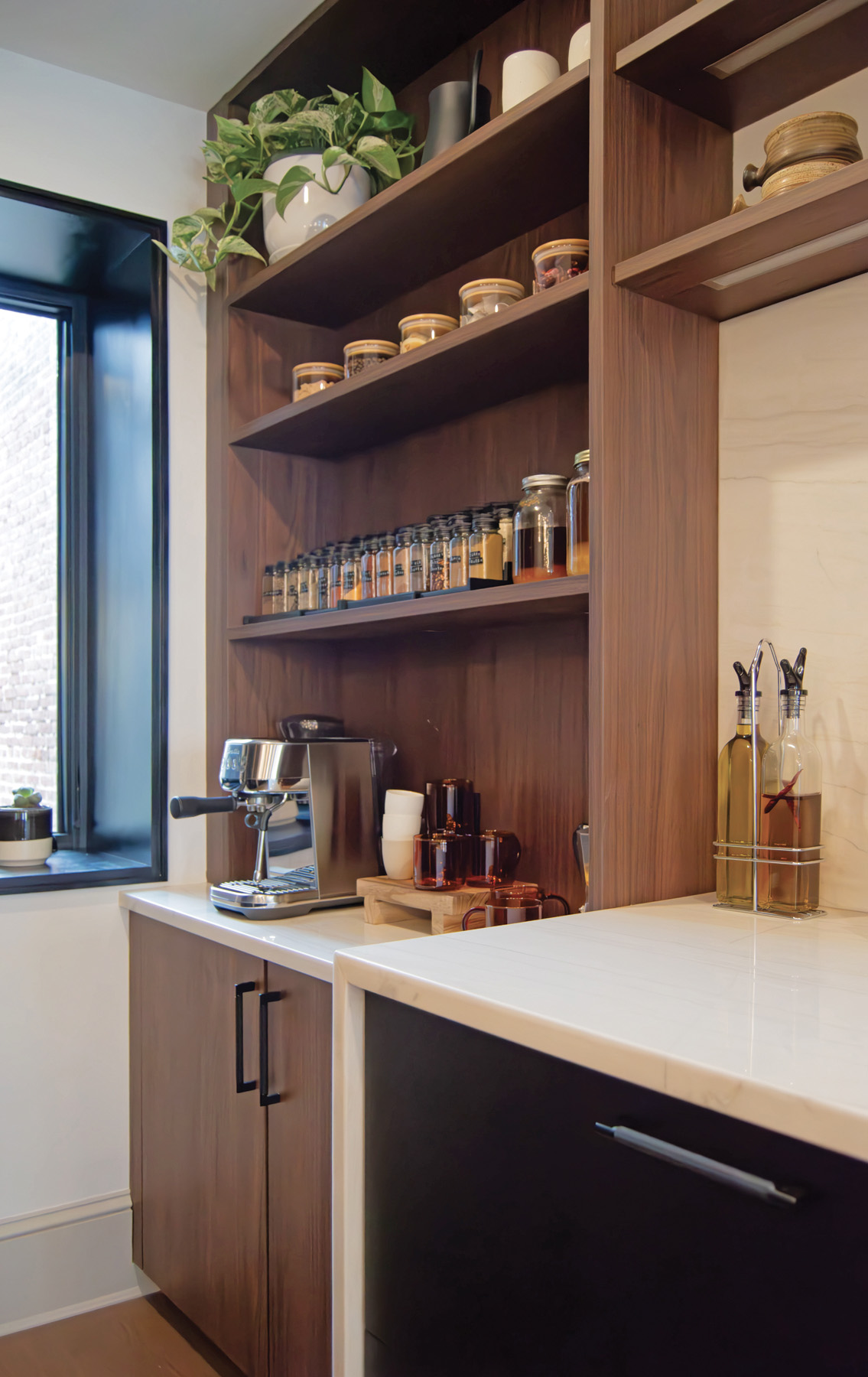Integrating the HVAC necessitated a deep packed-out wall to house ductwork, while a dropped ceiling housed the exhaust. The low windowsills presented the perfect opportunity to incorporate a coffee station lower than average counter height, allowing the taller quartzite-wrapped waterfall peninsula and back counter to shine. The peninsula format provides plenty of seating for guests and casual dining.