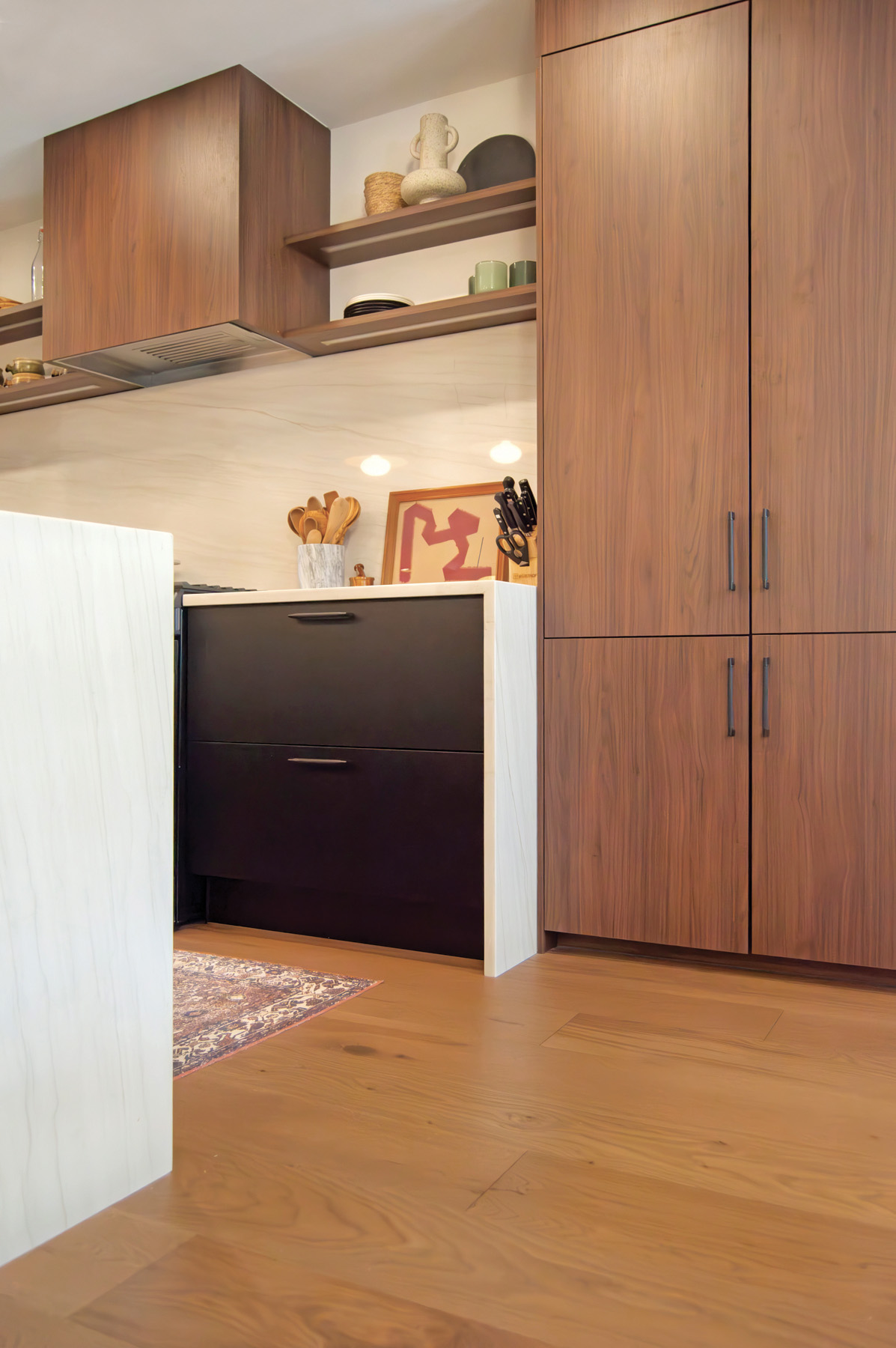 Made-to-order cabinetry by German brand Form Kitchens features wall cabinets faced in black satin that transition to a more historic palette with a walnut millwork finish face on the surrounding cabinetry and hood, smartly blending the old and the new.