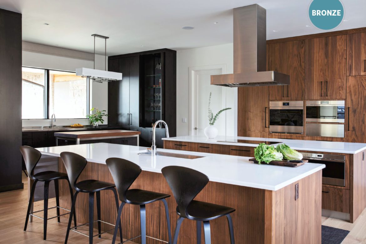 The main kitchen area showcases walnut natural cabinetry with black glaze from Décor Cabinets. Since the client’s preference here was to avoid wall cabinets, functional interior accessories were incorporated into each base cabinet for efficient storage. Creative use of stainless steel was featured throughout the kitchen, as seen in the toe kick and bespoke legs. Riverside decorative hardware in Matte Black from Top Knobs and Caesarstone’s Calacatta Nuvo quartz surfacing add the finishing touches.
