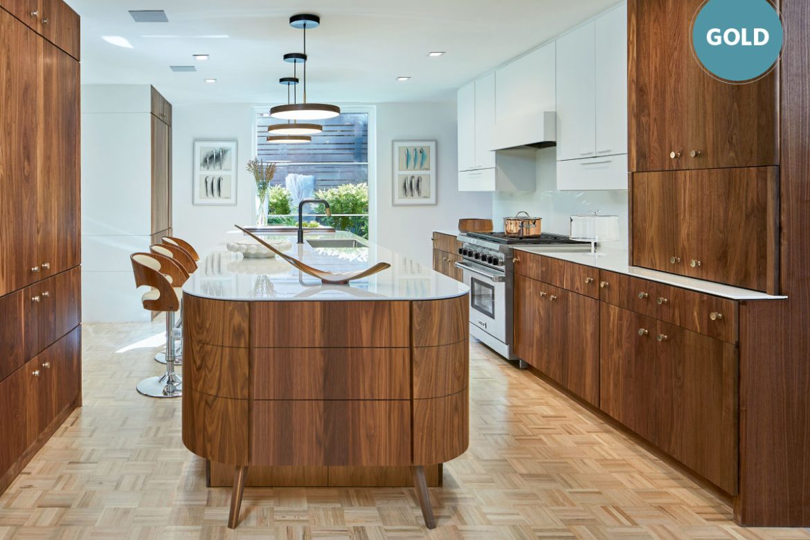 Once rounded corners were the focus, a palette of two contrasting materials was chosen to emphasize the curves. Custom figured walnut and semigloss cabinetry were selected – the figured walnut had life while the other did not; one was dark, the other light; one had motion and pattern and one was solid. Razor edge countertops and backsplash from Neolith in Arctic White added further contrast against the dark walnut and highlighted the rounded corners of the island.