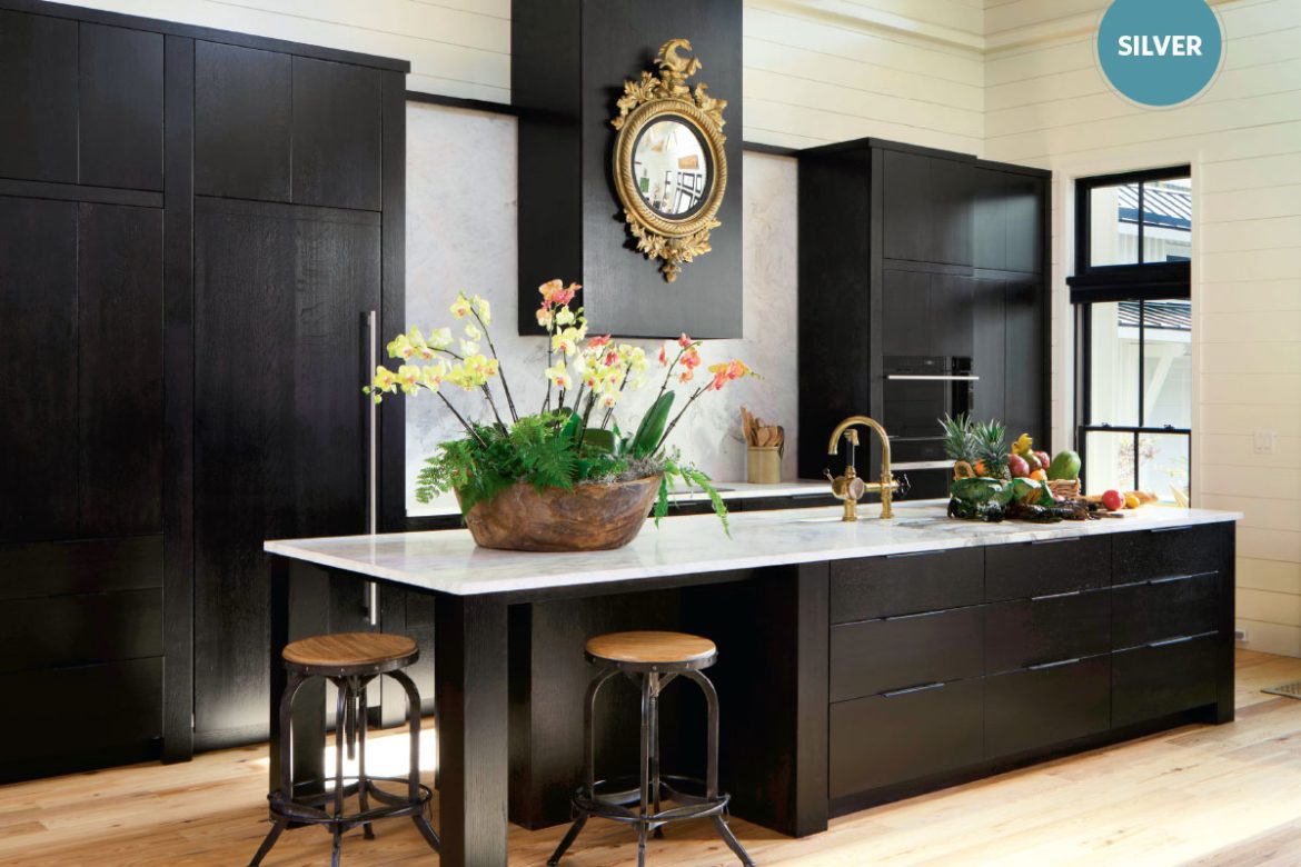 The island continues with the black cabinets and dolomite surfacing and includes a Kohler Iron Tones white sink, Waterworks Regulator faucet in a golden tone that coordinates with the antique mirror, and Bosch 500 series dishwasher in black. Recycled heart pine flooring allows the black cabinetry to pop.