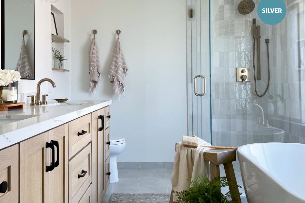 Though this master bath is only 95 square feet, the client’s request of the design team at Anderson Reconstruction was that the space have better flow, with a more open feel that was natural, light and calming. To open up the space, a partial wall and doorway between the vanity area and shower room were removed, which allowed not only the ability to take in more natural light from the window but also increase the shower size. Replacing a tiled-in tub with a Signature Hardware freestanding piece added to the open feel.