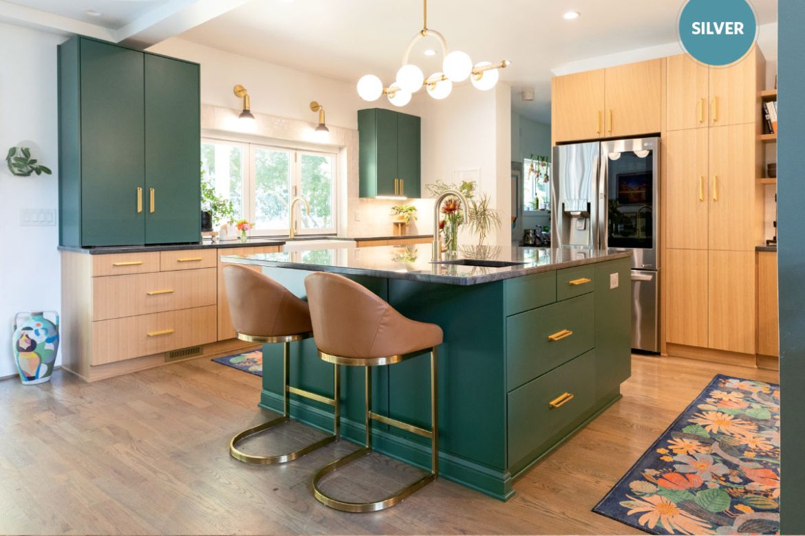 Opening the back wall to the outdoors illuminated the space with natural light and made outdoor dining more convenient. The large island centers the space and adds functionality with a wine and beverage refrigerator. It also provides additional storage and serves as an eating area. New low-emission cabinets from Bernier Cabinets, made with locally sourced wood, are topped with Wakanda Quartzite. The island and upper cabinets are painted in Benjamin Moore Garden Cucumber and the perimeter cabinets are white rift cut oak in a natural stain, both finished with Belwith Keeler’s Corsa pulls. An integrated Fulgor Milano gas range and hood help create a more intentional space and work well with the Zellige white gloss tile from WOW Tile and stainless steel refrigerator/freezer from LG Electronics.