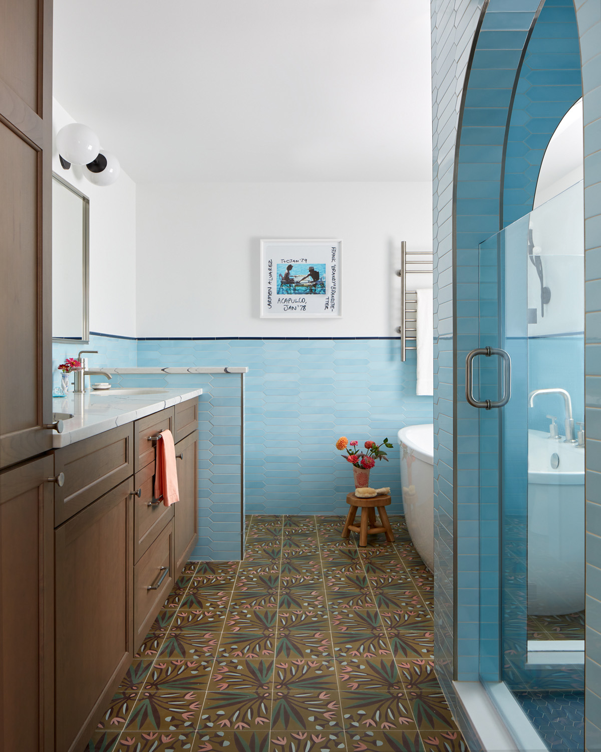 Denver-based interior designer Jennifer Medoff also features original artwork as one of her goodies – in her case, using custom glass tile mosaics. “For clients wanting texture, bling and a visual punch, glass mosaics are a go-to recommendation,” she stresses. They can show up in different rooms, but she often chooses them for shower feature walls. “I find that tight spaces present a unique opportunity to incorporate playful, wow moments and I love the drama, whimsy and reflective quality that glass brings.” Her tile artist is Brooklyn-based Allison Eden Studios. “Allison’s patterns and color combinations are endless, so I find that any tone can be set – from glam to playful to refined.” Like any custom detail, she notes, these mosaics do add time and thought to a project, but they also elevate the space and contribute to client satisfaction. “This intangible is the special sauce I always seek to incorporate into the homes I design,” Medoff shares.