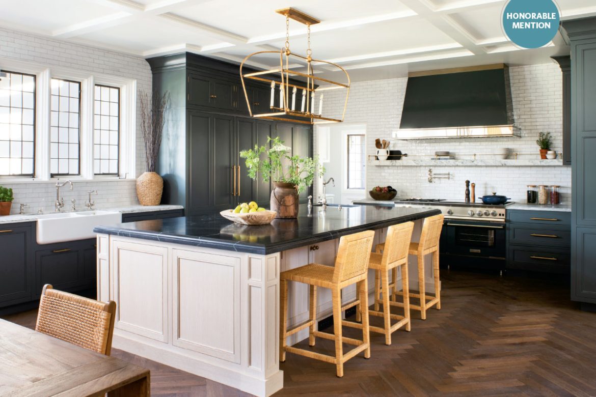 Dark painted perimeter cabinetry, along with the matching butler’s pantry, anchors the space in a nod to the home’s English design. The light oak island and breakfast hutch, adorned with aged brass hardware from Armac Martin, continue the traditional materials but deliver a more modern aesthetic with the light washed hues of wood.
