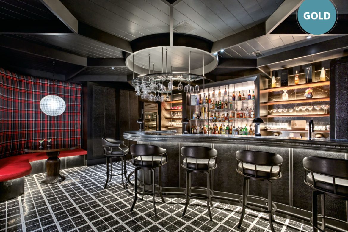 The bar, featuring a brushed cast pewter bar top by La Bastille, offers seating for seven, and is flanked by warmly lit floating glass shelves by Fittings Metal Collection and Essex cabinets in Black Galaxy from QCCI. The banquette, set against a cushioned tartan wall, offers a club-inspired niche for additional seating. A polished metal fixture above the bar functions as both a stemware rack and an uplight chandelier. Silvery antiqued mirrored glass tile by Artistic Tile, Masia Nero subway tile, dark honed quartz countertops and warm wood accents round out the sophisticated yet edgy aesthetic. A Monogram Wine Reserve and undercounter icemaker, freezer and 30″ beverage column from True Residential add beauty and function, as do the Blanco Precis sink and Brizo Levoir wall-mount faucet.