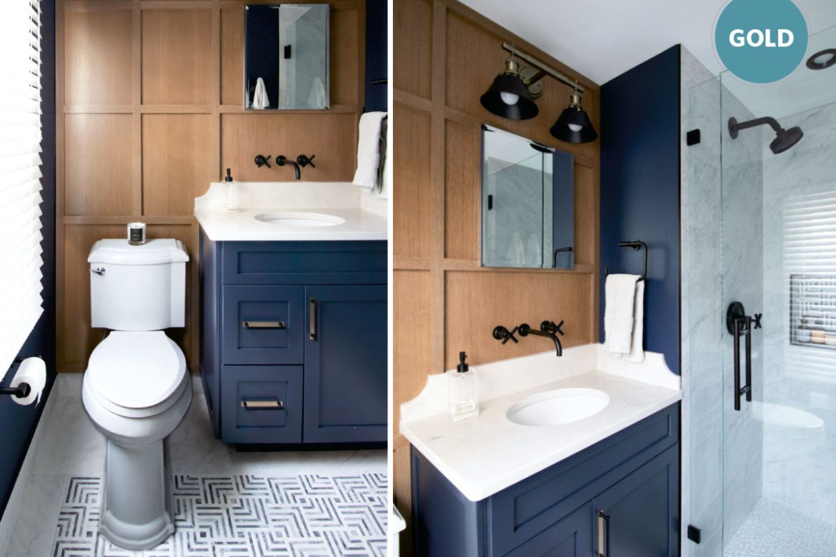 For this ensuite primary bath, designer Christina Fukumoto’s client drew inspiration from dark, moody spaces reminiscent of a cigar lounge or country club. To achieve this aesthetic, she incorporated warm wall paneling from Dura Supreme Cabinetry in quartersawn oak with a navy blue vanity, white marble countertop and Pub House Collection decorative hardware from Schaub & Co.