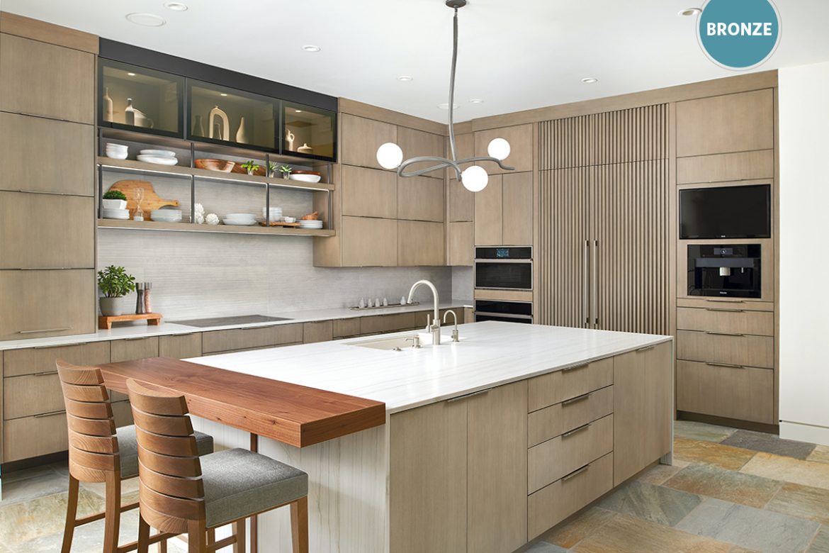 Rift cut white oak slab doors with a taupe stain from F1 Cabinets and White Macaubus satin quartzite from Arizona Tile set the tone for the space. Along the back wall, a bank of upper cabinets is broken up by illuminated glass-front cabinets and shelving, with an inset vent hood and Porcelanosa backsplash.