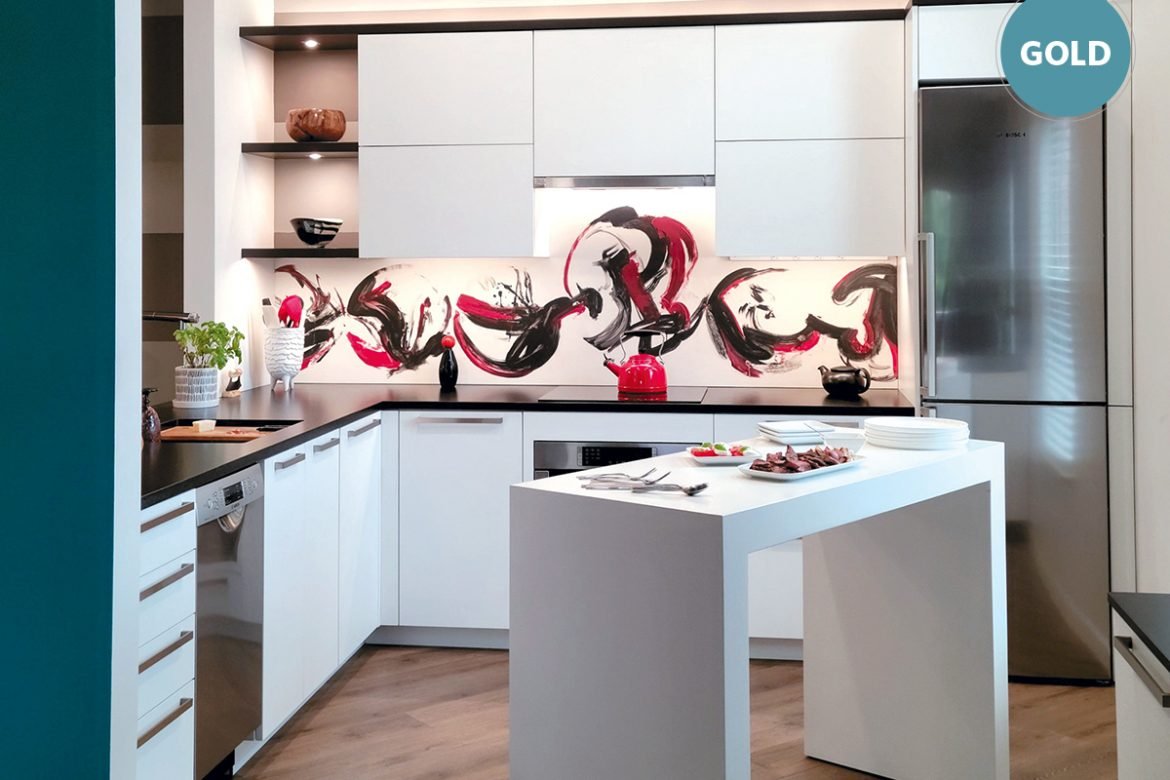 Small and mighty is the way to describe this 96-sq.-ft. kitchen, designed by elizaBeth Marcocci, CMKBD, CAPS. The client, who is an artist, wanted the condo kitchen to be created around several pieces of original artwork, all while delivering a more open floor plan and additional storage and counter space.