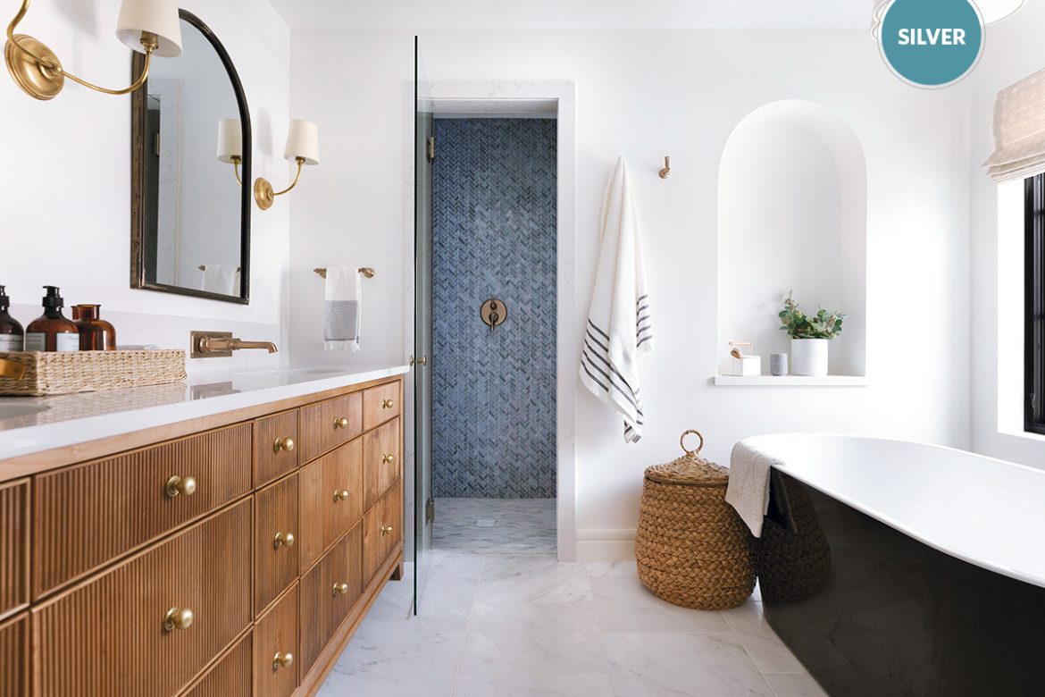 Creating a sense of separate spaces within this 130-sq.-ft. bathroom in Minneapolis was the task at hand for designers Katie and Jesse Kath, as a separate area for the shower, tub, vanity and toilet were all important factors to the homeowners in their morning routines. Ensuring privacy from showering to using the toilet were large considerations, as was making the space feel open enough to stand on its own in an en suite environment.