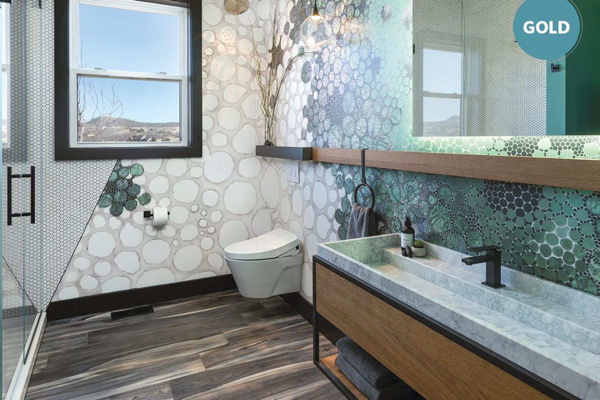 In this Castle Rock, CO home, a choppy layout and oversized closet made this otherwise sufficiently sized 85-sq.-ft. bathroom feel cramped. To open up the space, designer Gina D’Amore Bauerle removed the closet and a secondary doorway separating the sink from the toilet, replacing them with the steel framed floating vanity with an oversized marble trough sink from Porcelanosa and Morrow Bay faucets by California Faucets.