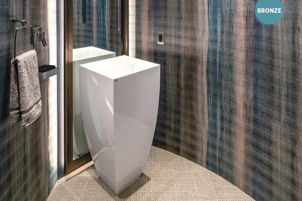 Because demo had to be kept to a minimum, the designers – Lori Carroll, Kat Saucedo and Becky Eppihimer – were tasked with finding finishes that would fit and accentuate the existing layout. An eye-catching blue and gray wallcovering from Paris, France was selected to replace the outdated sponge painting, while raised beige field tile was selected for the floor to provide a neutral yet visually interesting base for the design.