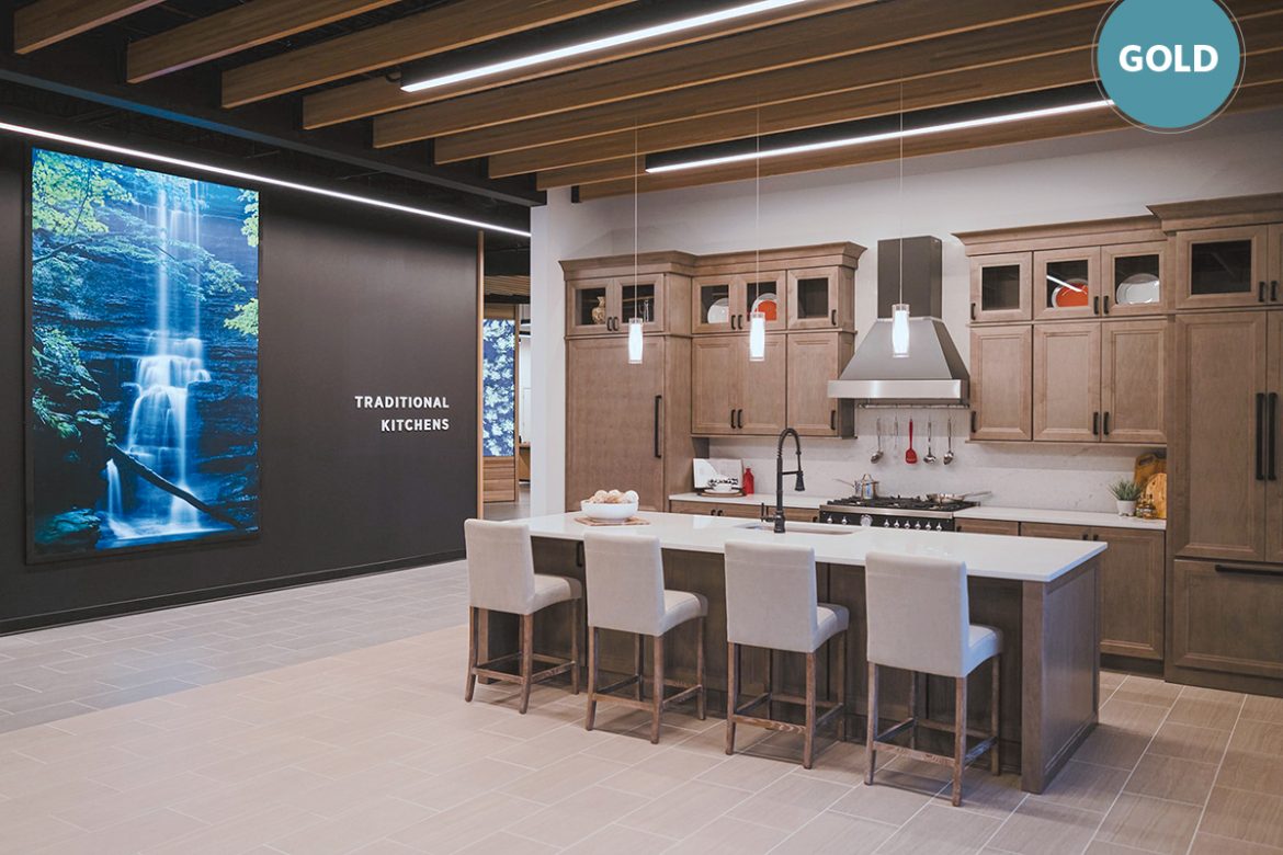 The ultimate goal for this 9,300-sq.-ft. showroom, located in Glenview, IL, was to present visitors with an immersive experience – 11 interactive full-size kitchens outfitted with all appliances and globally sourced materials – that could showcase every door style in every color SR Cabinetry offers.