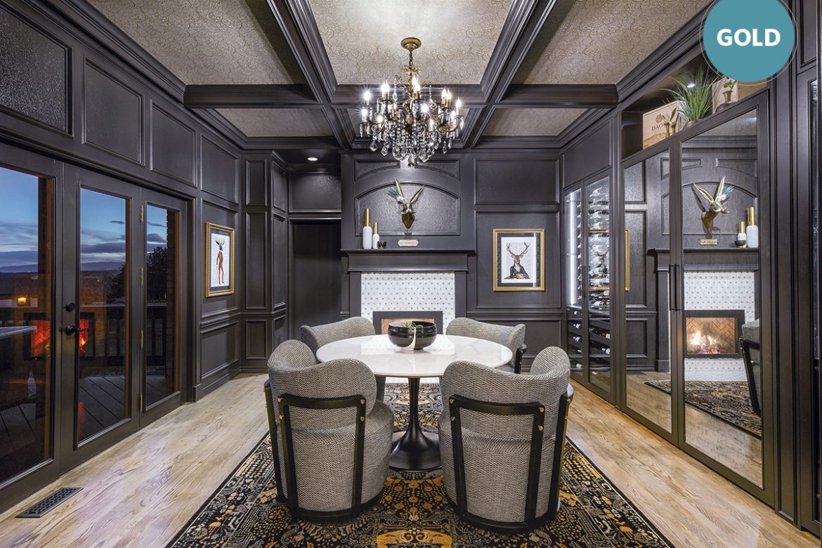 Gina D’Amore Bauerle chose a black and white color palette for the room, and used gold accents to add an opulent feel. Existing ceiling coffers and millwork from the study were preserved and painted black to blend in with the finish of the new wine storage cabinetry from Abacus Cabinetry. Pearlescent Kravet wallpaper was also installed in the ceiling grid between the beams to add in some intricate details and metallics.