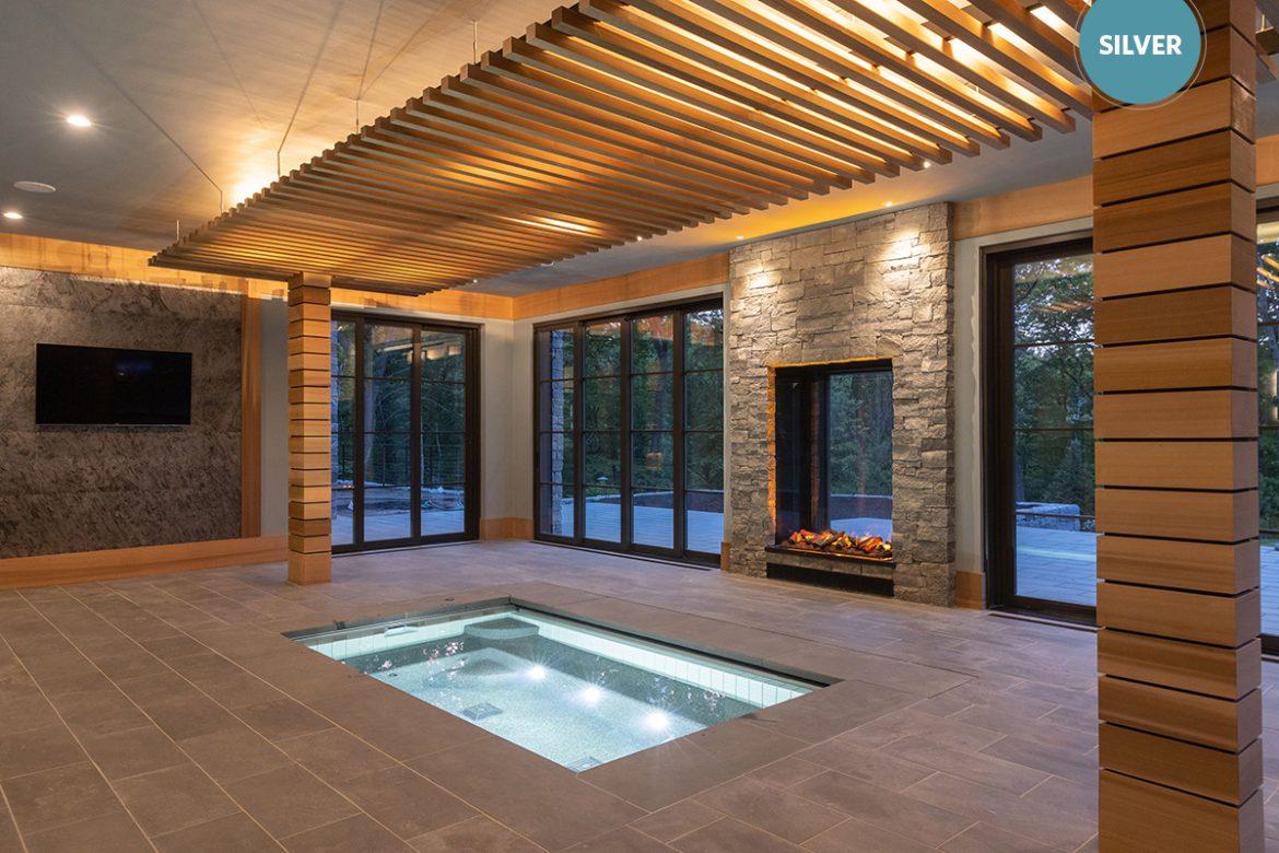 The objective of this 750-sq.-ft. hot tub room was to marry the indoors and outdoors, as well as incorporate the architectural details of the Prairie Style, made famous by architects such as Frank Lloyd Wright. The clients wanted an entertaining and spa space that could accommodate an in-ground oversized hot tub and feel like an escape from the rest of the home without clashing with the design aesthetic. In addition, they wanted the room to take advantage of the breathtaking property views.