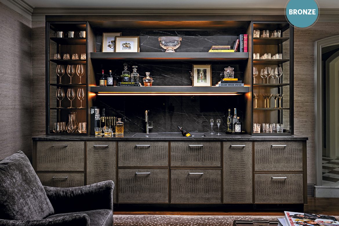 Masculine and moody set the tone for this gentleman’s bar, designed by Lauren Tolles and Tori Olijar with Sullivan-Strickler Design. Dark crocodile leather, walnut, steel and marble-like porcelain work together to create depth, character and mood.