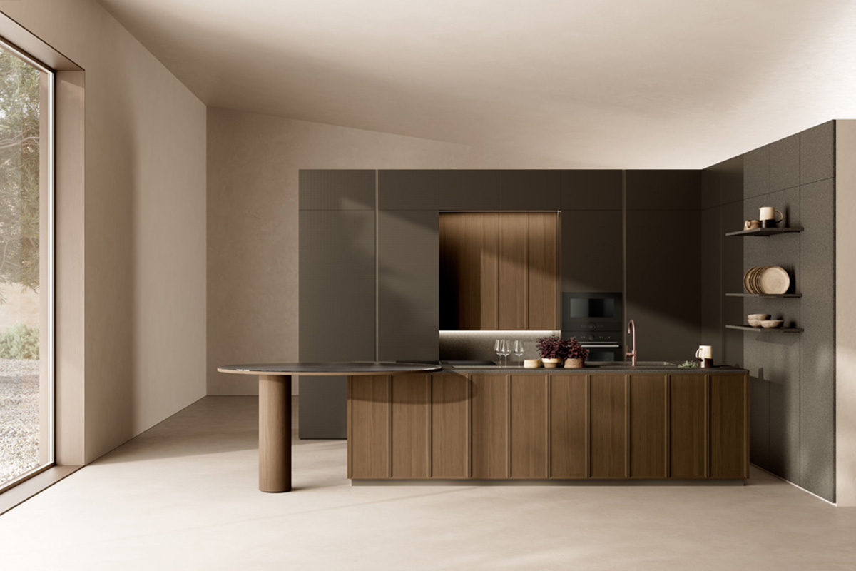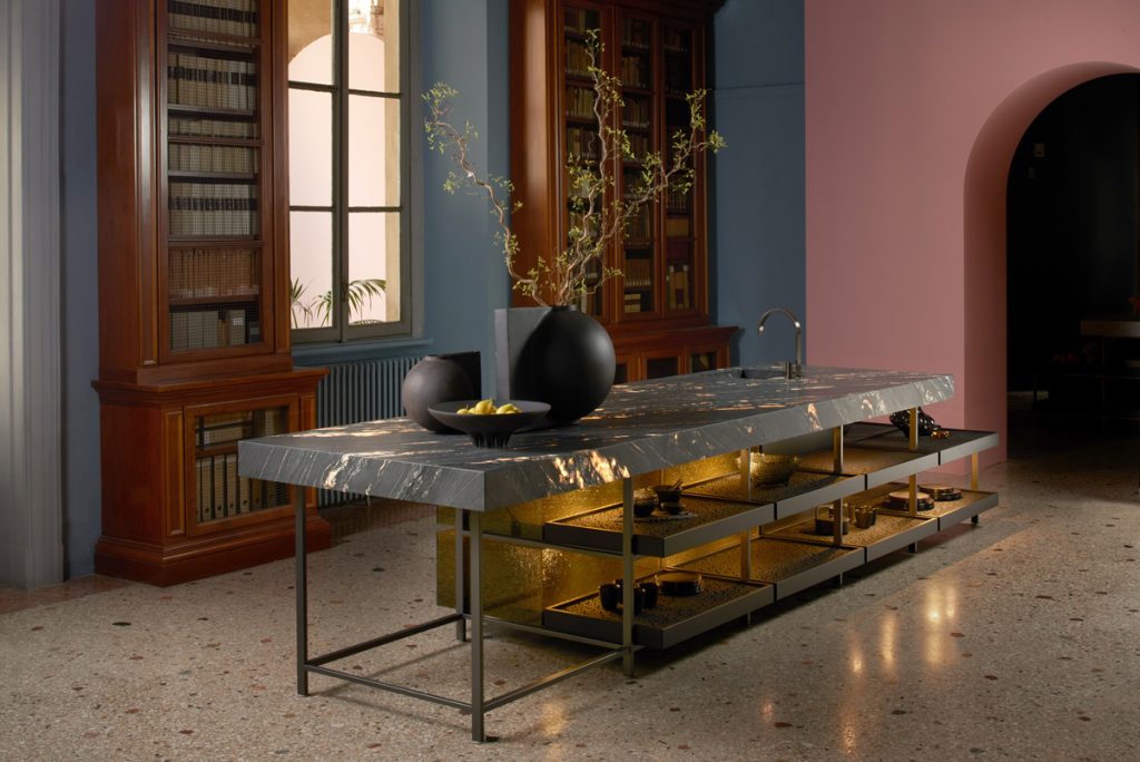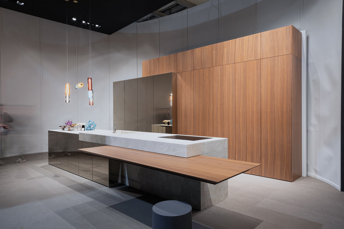 Islands were also statement makers at EuroCucina, often covered in surfacing that was bold and colorful. Quiet white marble looks with gray veining were limited, replaced by countertops and backsplashes with vivid color combinations and movement. Multiple-leveled islands were the norm, distinguishing prep areas from dining spaces via different heights and materials.