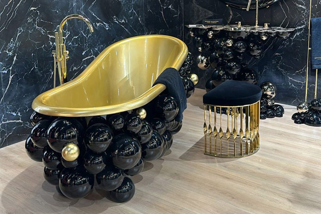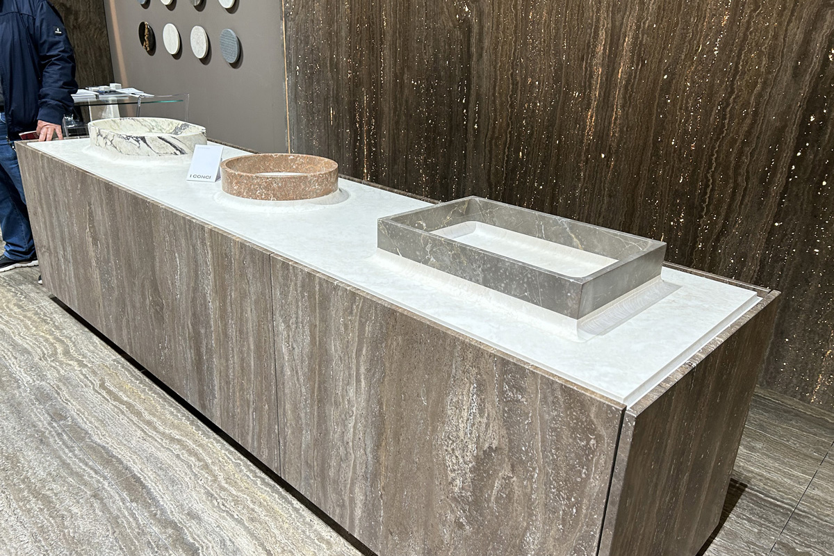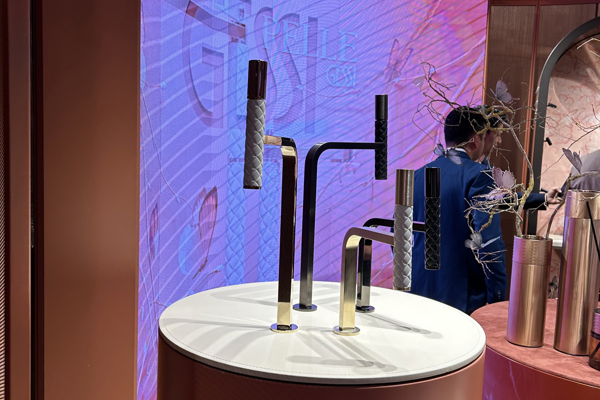 Bath sinks and faucets are also in focus with visitors, with material choices pushing the boundaries past expected. Faucets embraced not only multiple finishes but multiple materials, including stone, teak, crystal and leather. Glass and crystal sinks were also seen in abundance at this year’s show, along with geometric and asymmetrical washbasins and pedestals. And metal, especially gold and bronze tones, added sparkle to sink offerings.