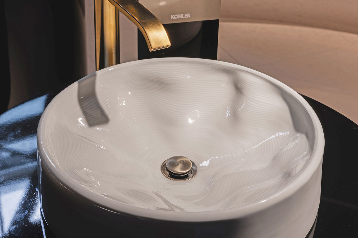 Wood, especially in paler tones, was a popular staple for vanities, many showcasing interesting grains and veneers. Curves and fluting were everywhere, along with chunky hardware that added interest. Metal trims, including banding around drawer edges and countertops, as well as legs and built-in towel racks, coordinated with the hardware to deliver a jeweled effect.