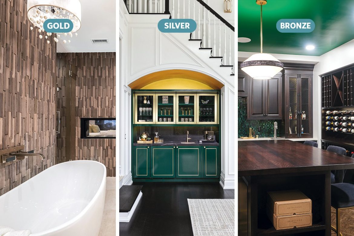 A major challenge for Lauren Tolles was melding the modern, cosmopolitan feel the homeowner desired with the traditional wainscoting and overall transitional aesthetic of the space. She chose a high-gloss emerald and brass bar for the alcove, which adds a pop of color. A dark Greystone porcelain gives the bar a rich, opulent edge.