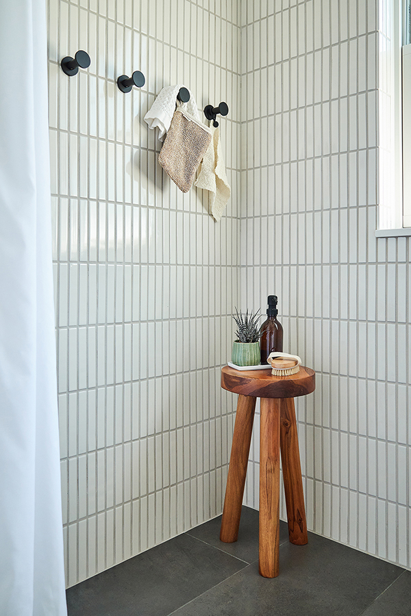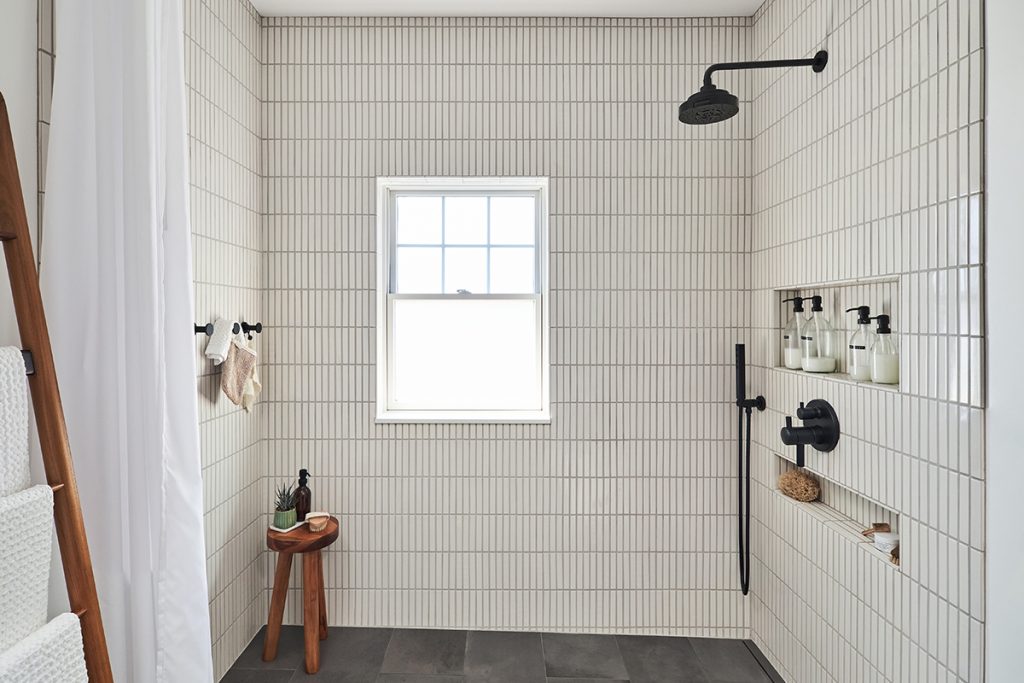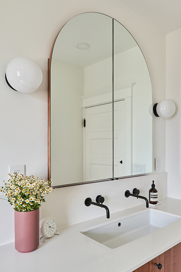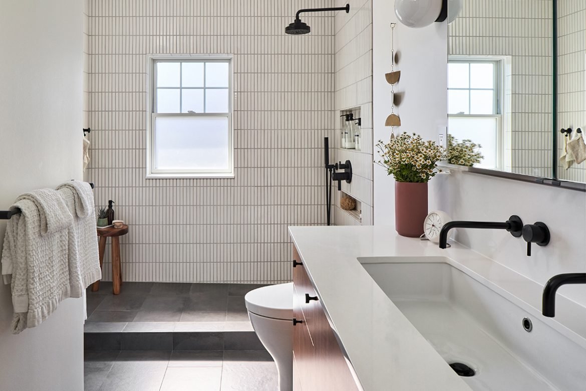 This is the only bathroom in the clients’ 1906 foursquare home. As it’s shared by four people, the clients wished to renovate it to better accommodate their needs. The original clawfoot tub and bulky but small medicine cabinet no longer met their bathing and storage needs. The team installed a large shower at one end, bathing nook for towel storage, and custom vanity, and medicine cabinet, while also adjusting the toilet location. They opted for an elongated basin with two faucets and an extra-wide two-doored cabinet above. The shower features two nooks for the clients’ extra storage needs. The updated bathroom is a fully modern complement to the clients’ classic foursquare home.