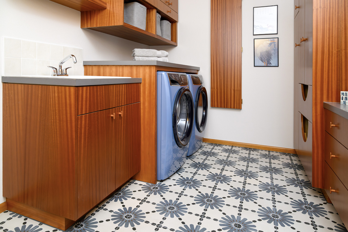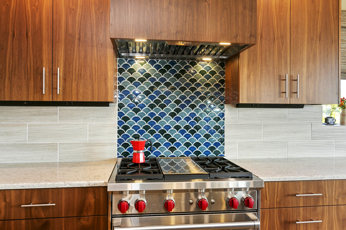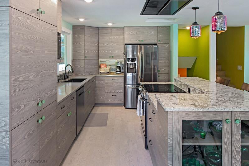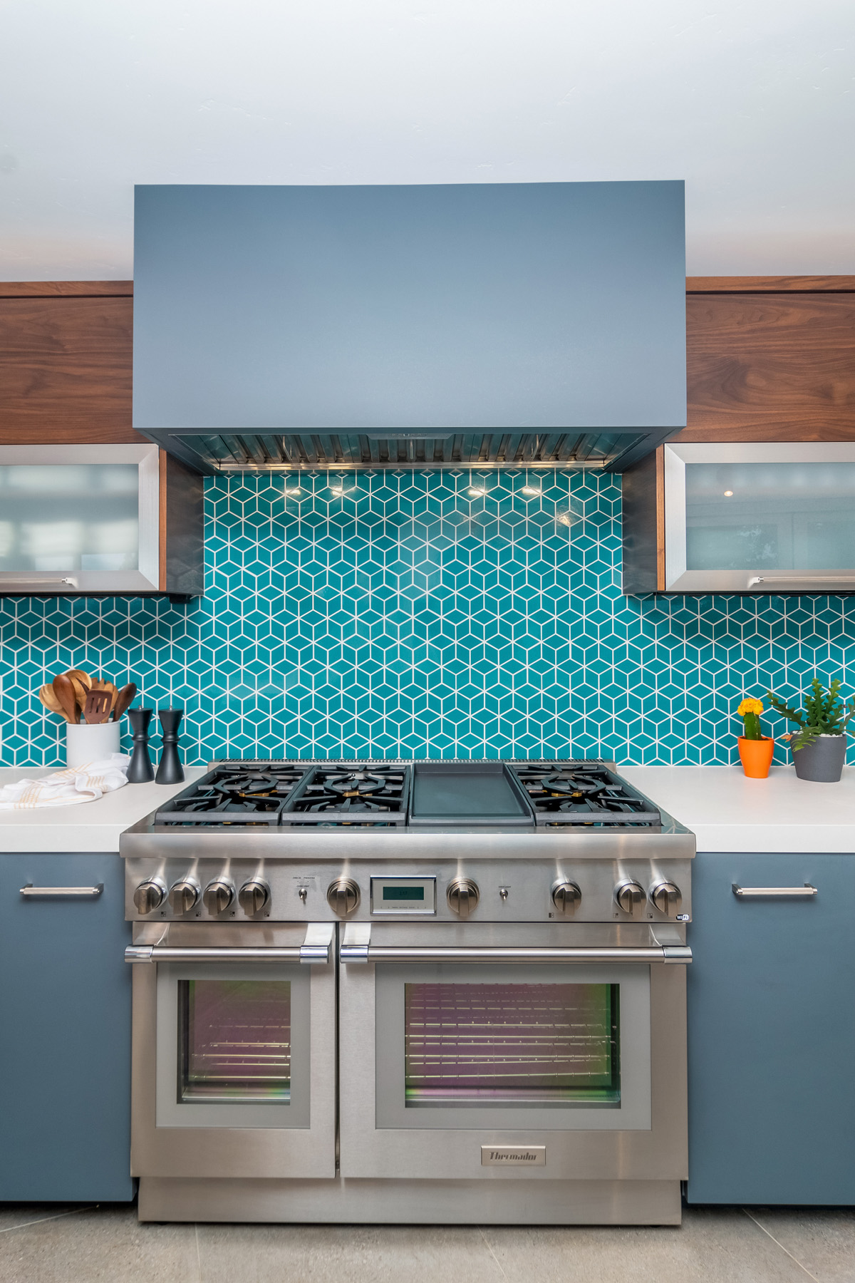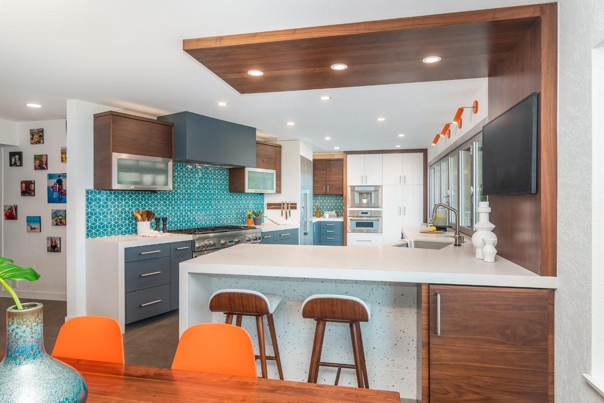 This vibrant kitchen from Jackson Design & Remodeling was designed for a family seeking a space that balances the timeless appeal of their mid-century modern home with modern functionality. Its bold, clean cabinetry, turquoise geometric backsplash and terrazzo countertop tile create additional nods to the home’s history. (See feature image.)