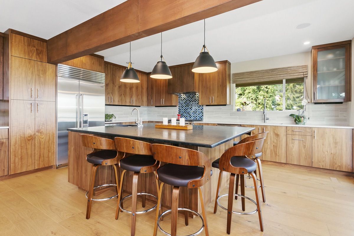 This kitchen, located in a mid-century home, was updated with an eye toward maintaining its historic character. The client wanted to modernize and update things, while embracing the lake view. DuByne achieved this with custom slab front walnut cabinets, soapstone island countertop and the playful curved tile behind the range.