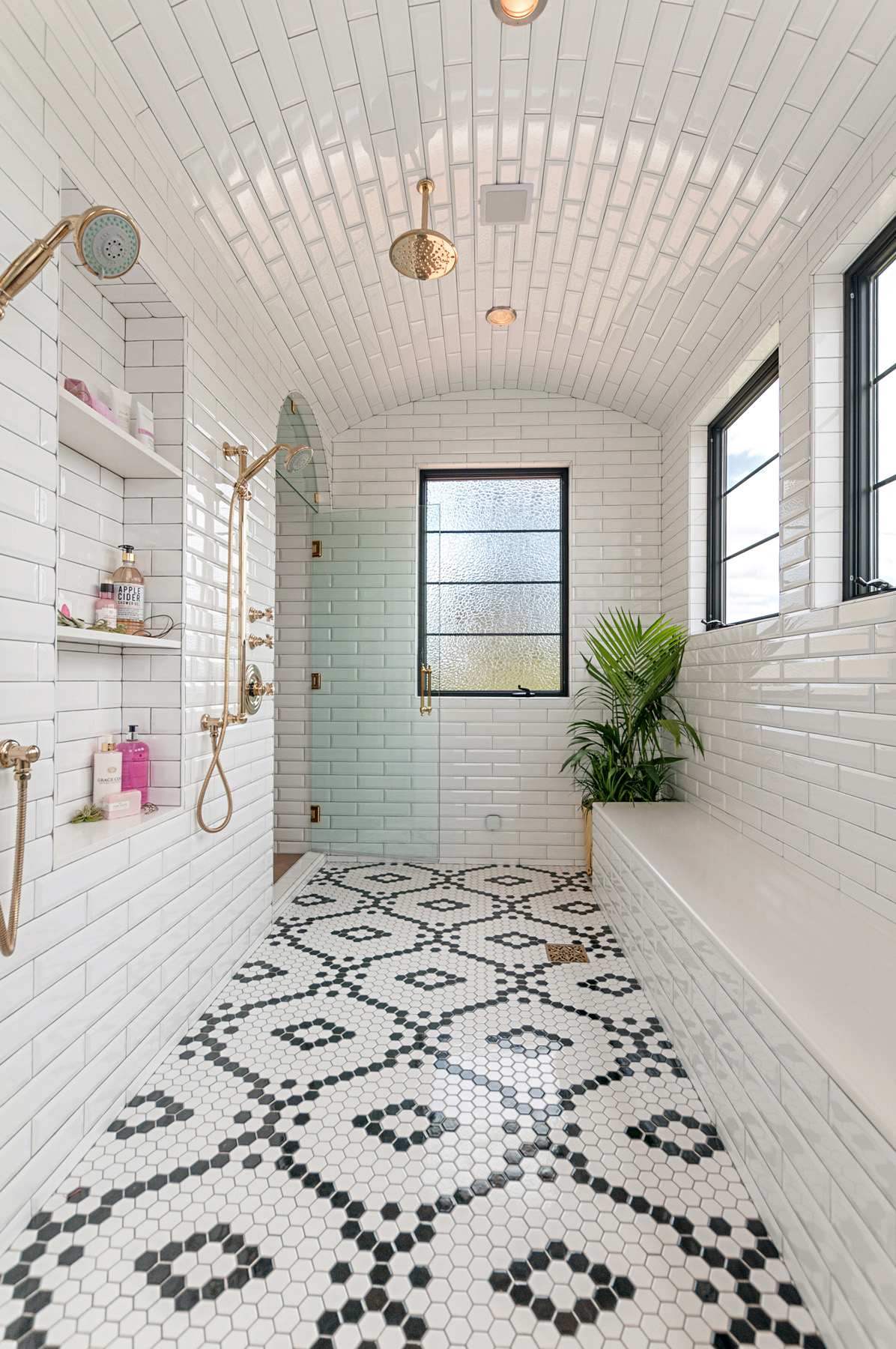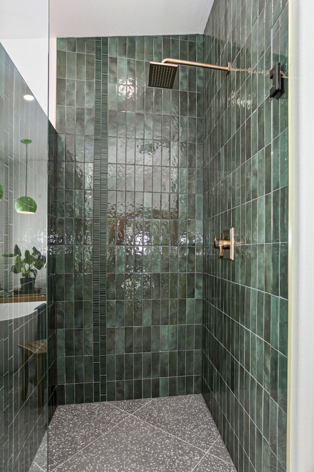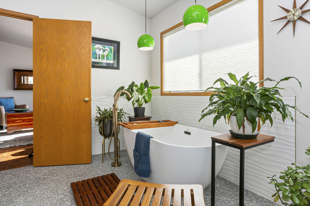 For DuByne, whose area of service encompasses a number of mid-century homes, the history and style of the home tends to inform the design elements she and her clients are drawn to. She points to one specific home for which her firm has had the opportunity to handle most of the remodels over the years. “It’s an original MCM on a lake, with a 1990s addition to enlarge it,” she explains. “The clients have always wanted to stay in the MCM style in terms of their furnishings and decor. We are prepping to do their final bathroom – I imagine the original American Standard pink sink and toilet staying and working around those! What a dream! We’ll be adding a color terrazzo floor and green hexagon tiles on the shower walls.”