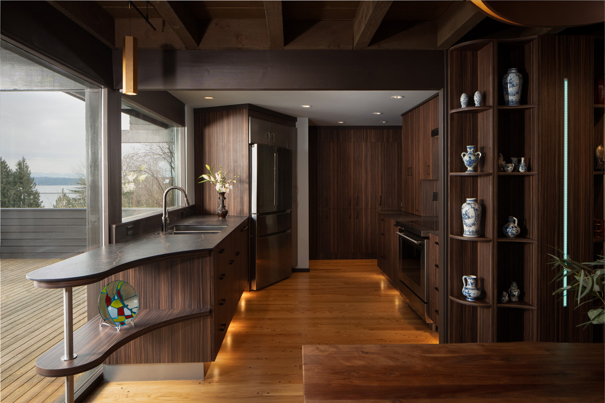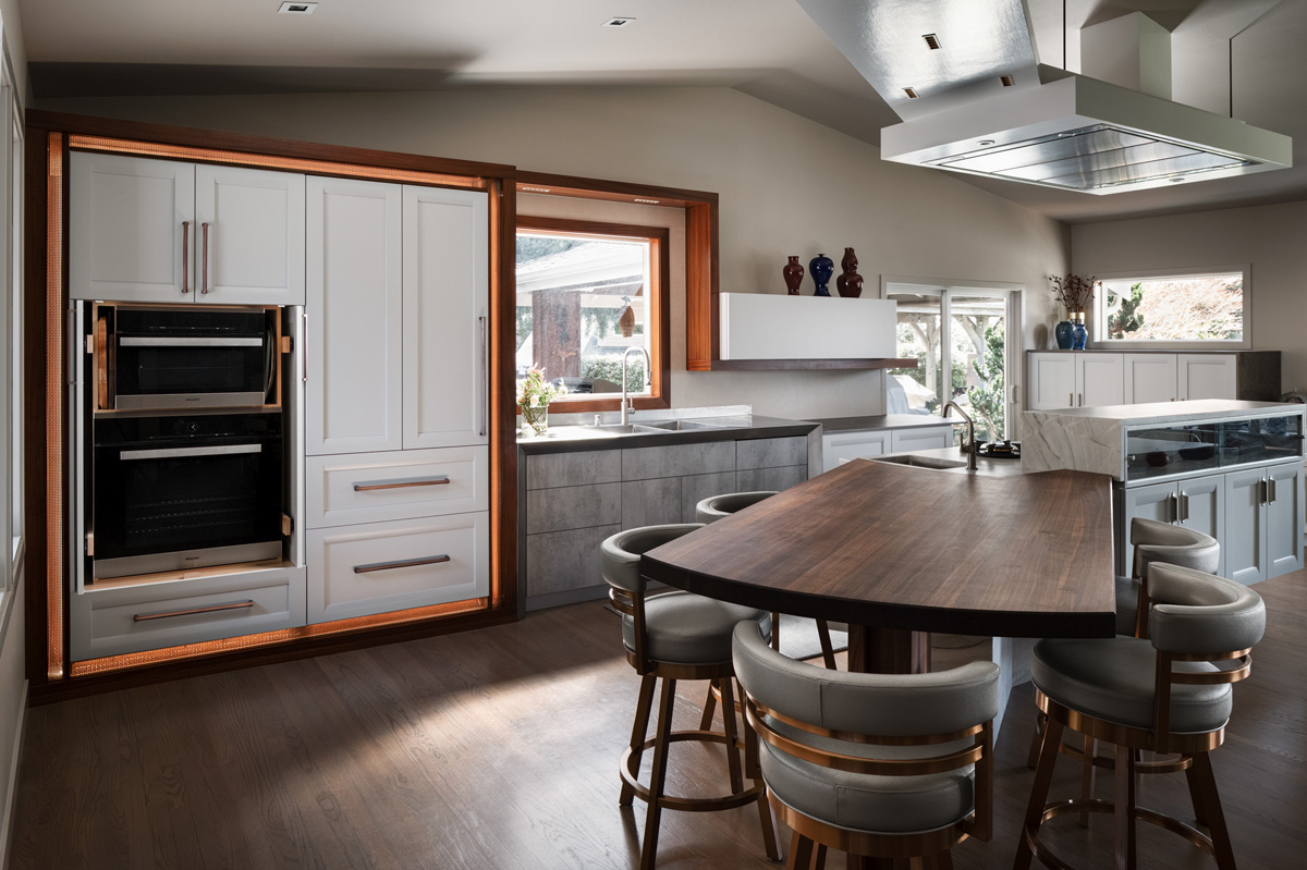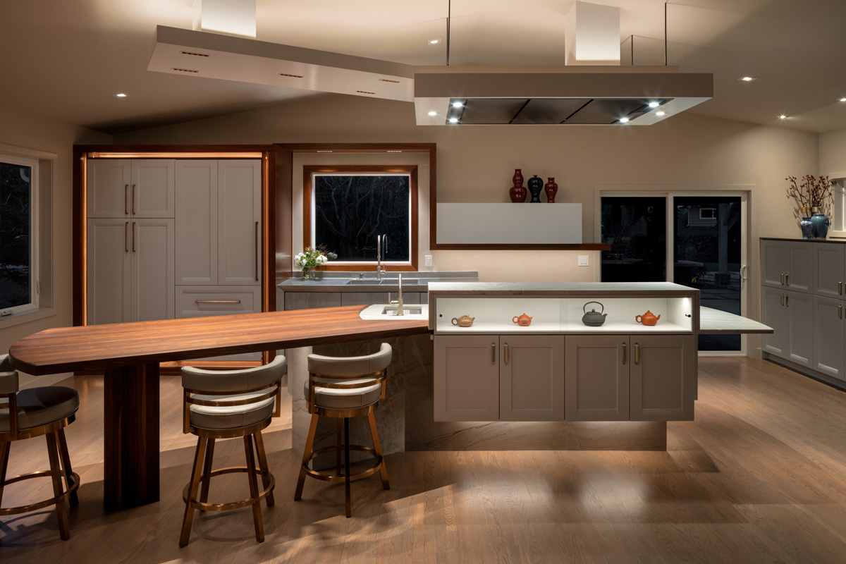 Landon played with variations on a theme of form in this kitchen – the arc on the end of the seating area, echoed above and beneath the work area, in part thanks to the toe kick lighting. Open shelving in the island showcases the owner’s collection of pottery.