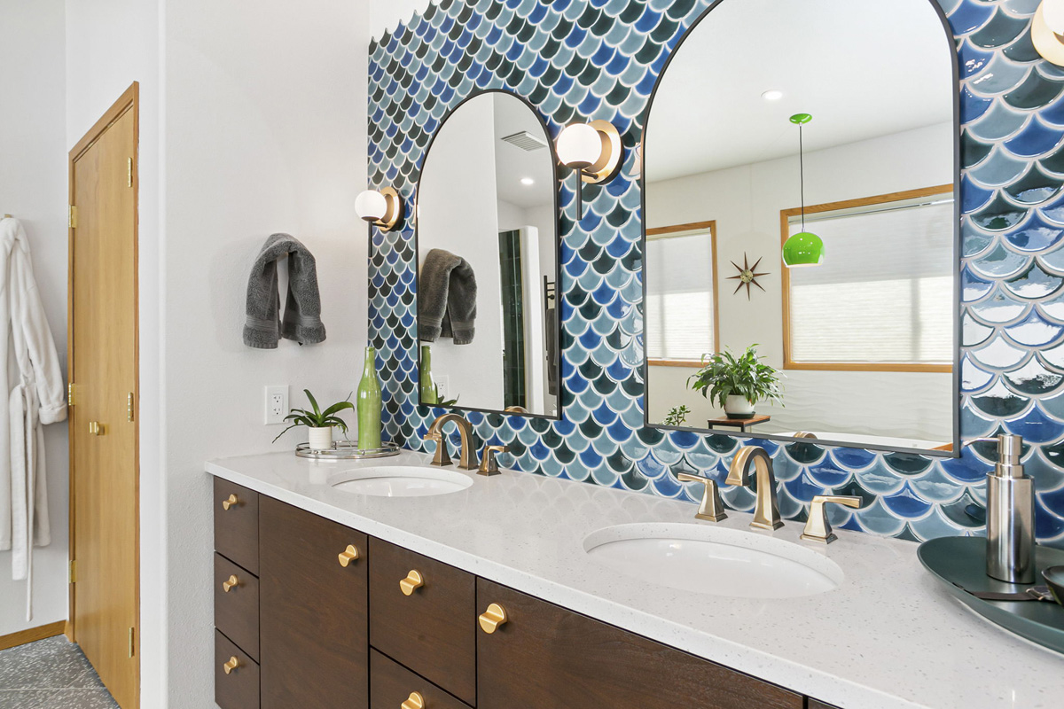 Both from the same mid-century modern home, these baths by Distinctive Interior Designs feature locally-made custom cabinetry and pops of color in the tile and lighting fixtures – hallmarks of the home’s historic style. The clients were after function and updates while keeping to the retro and MCM style.”