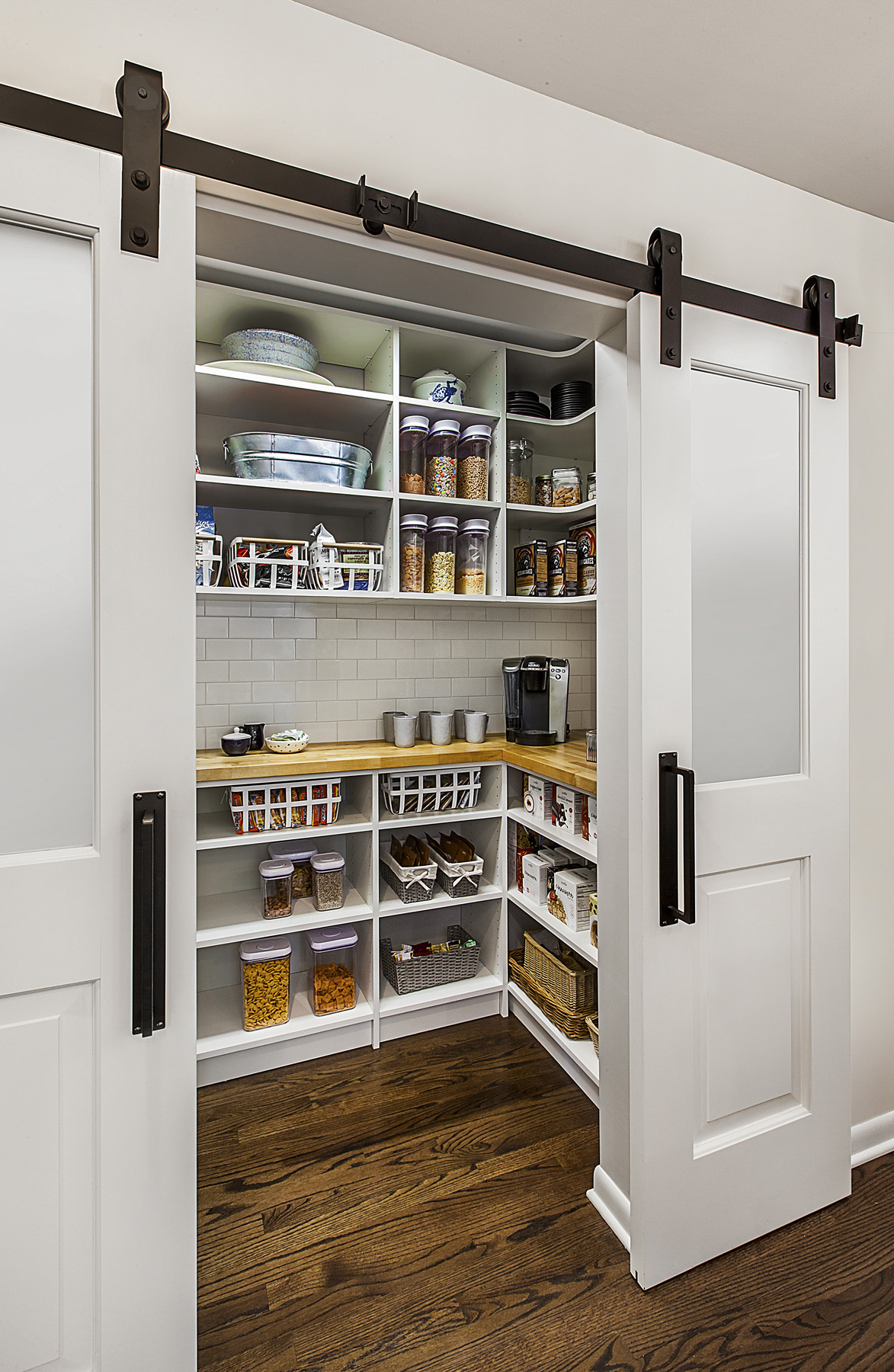 “Our clients still want microwaves, but they don’t use them as much as they once did,” she says. “It isn’t as integral as an appliance, so the pantry is a great place to store it.”