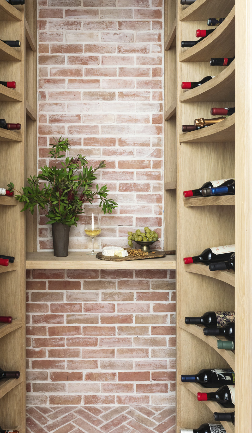 One focal-point feature of this wine room designed by Lynn Holender includes brick set in a traditional pattern on the wall and in a contrasting herringbone pattern on the floor. White oak shelves provide enough storage for more than 200 bottles of wine, as well as accessories. The slightly curved shelves ‘soften’ the visual and give a touch more room for her client to maneuver when she is working within the space.