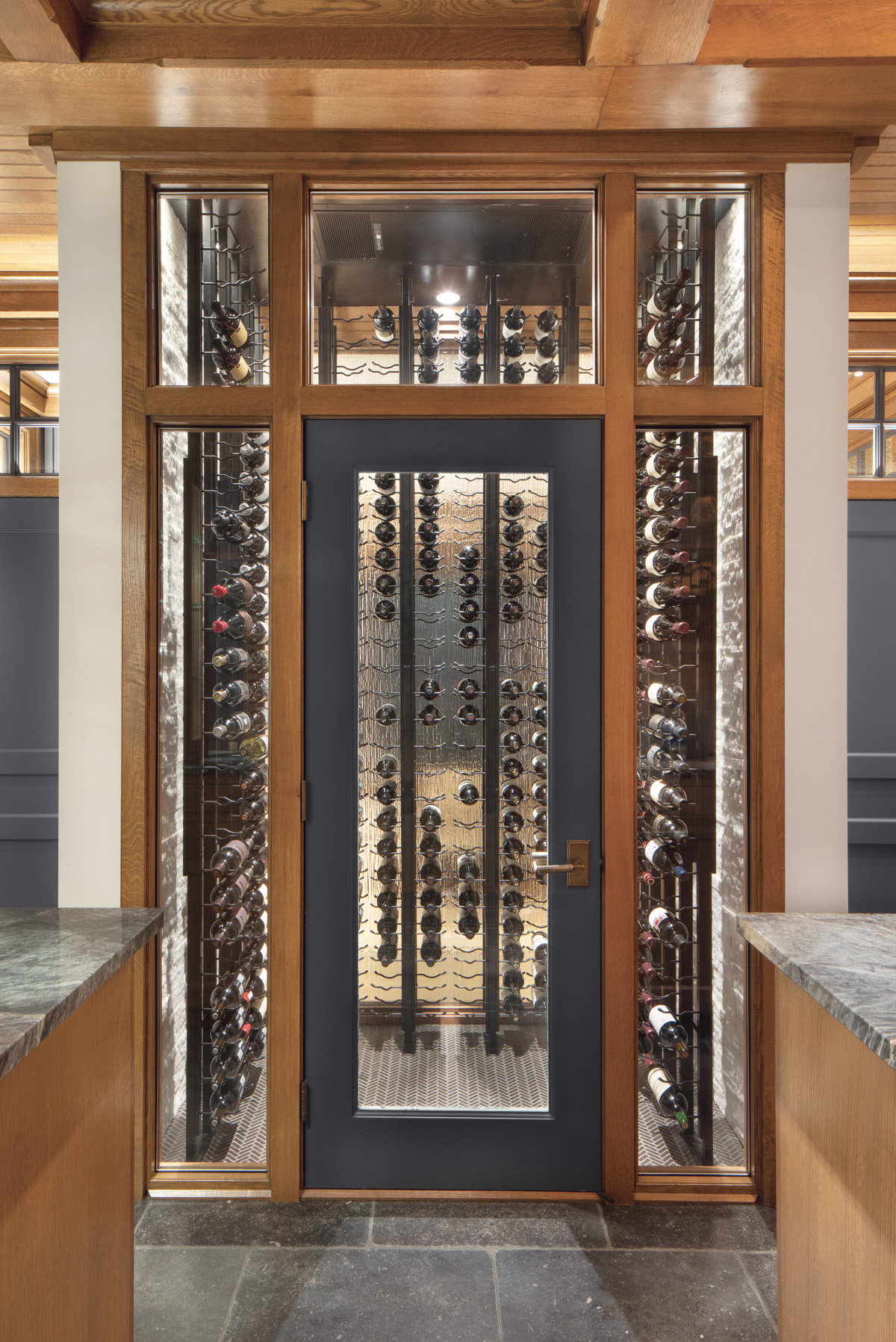“Wine used to be stored in basement cellars because they were a perfect environment for keeping the wine cool naturally,” he says. “But now we have sophisticated and elaborate mechanical cooling systems, so we’re seeing a lot of people move their wine out of the basement and into a temperature- controlled space upstairs.
