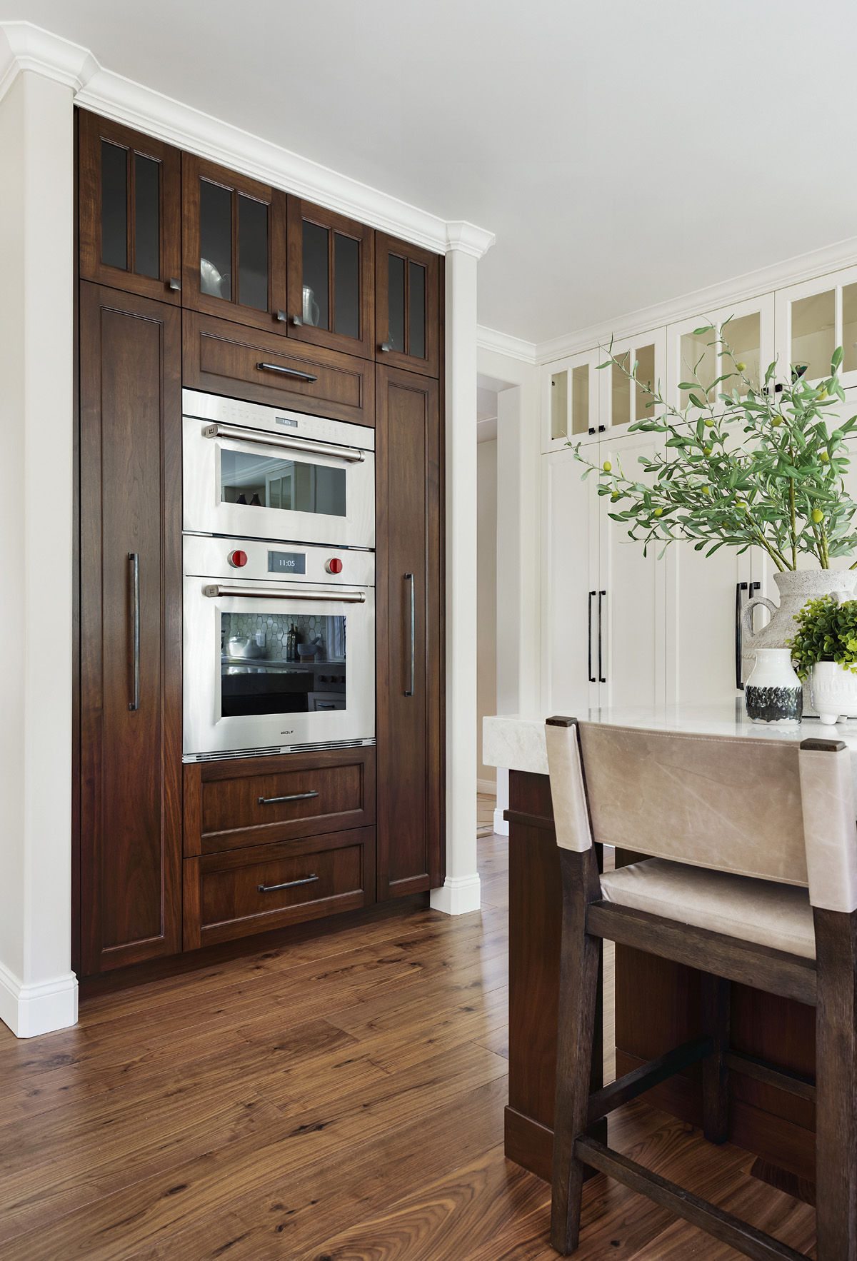 To further the traditional vibe, the designer incorporated walnut into the island, using it to frame the marble and define the seating area. He also used the wood as the interior for the glass-front wall cabinets.