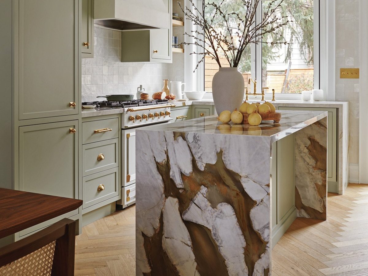 Its subtle sage green base, which matches that of the perimeter’s base and wall cabinetry, is topped with Calacatta D’oro quartzite that features deep browns, taupes, golds and grays against a foundation of warm white. The island’s waterfall edges highlight the stone’s dramatic veining pattern that is on full display from the adjacent dining room. The designer repeated the sophisticated and timeless stone as the perimeter’s worktop surface.