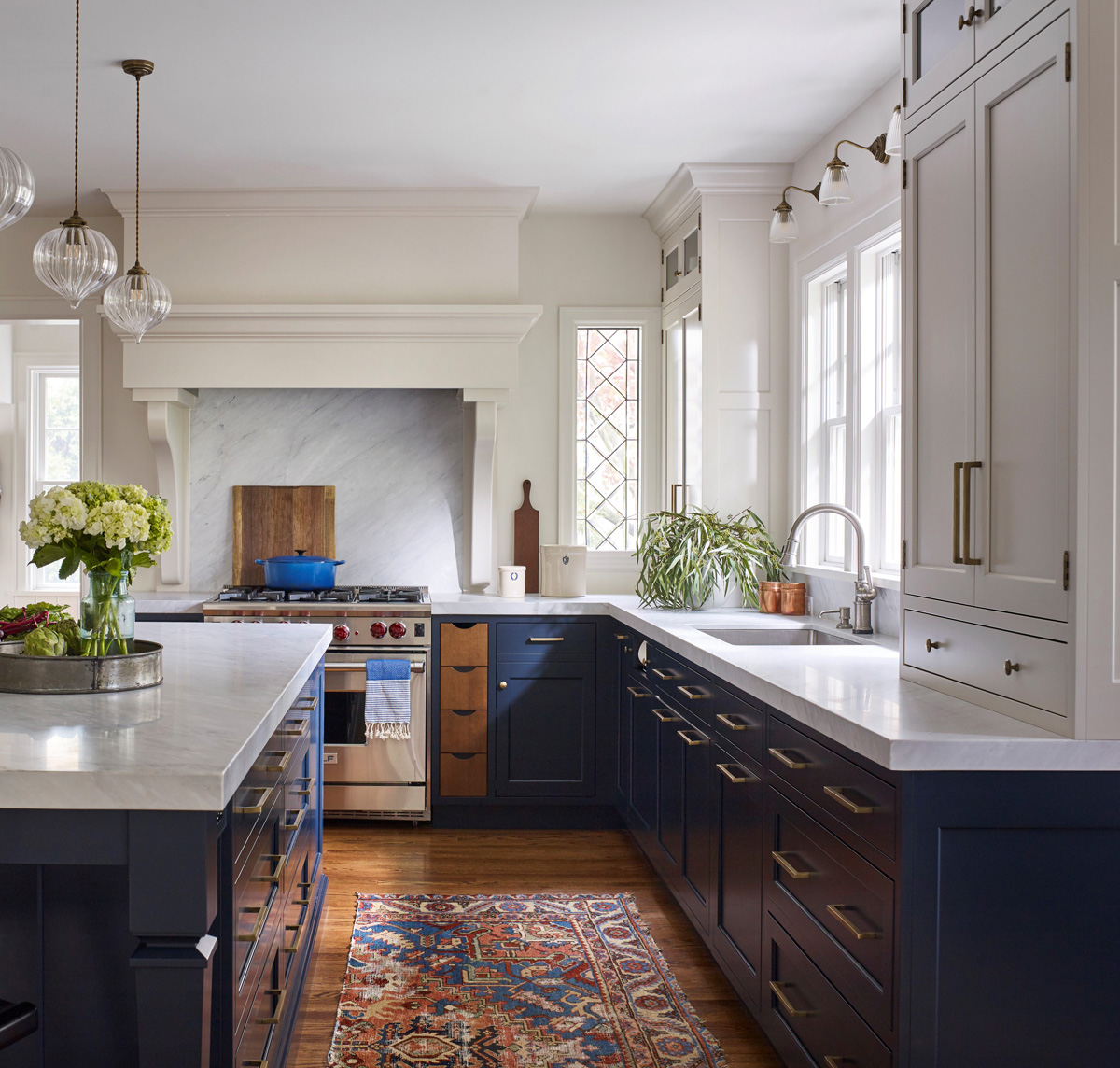 Crystal Maki’s clients wanted their new-construction home to feel somewhat historic, thus the shaker cabinetry was painted in Farrow & Ball’s Green Smoke and Shaded White. Gold-toned Schaub & Co. cabinetry hardware complements the Rohl Satin English Gold faucets and Coppersmith Brass ventilation hood.