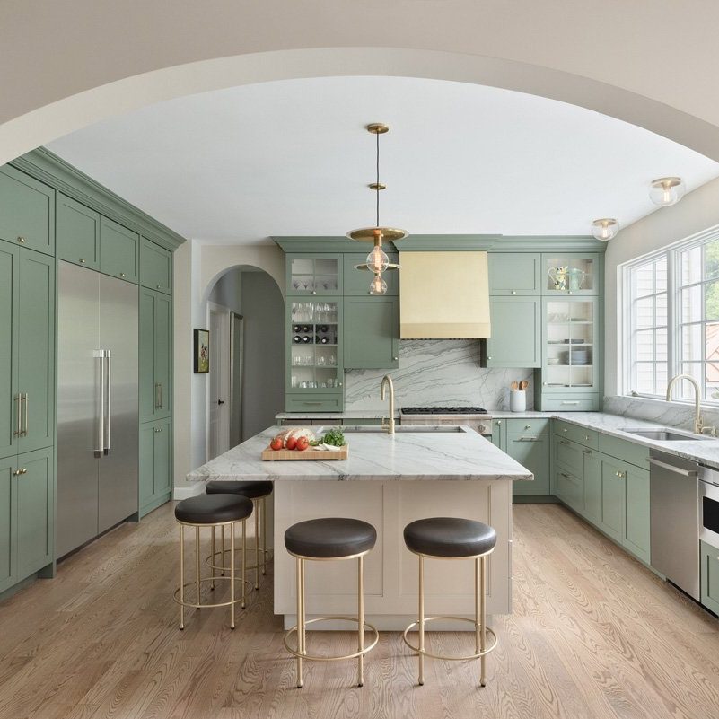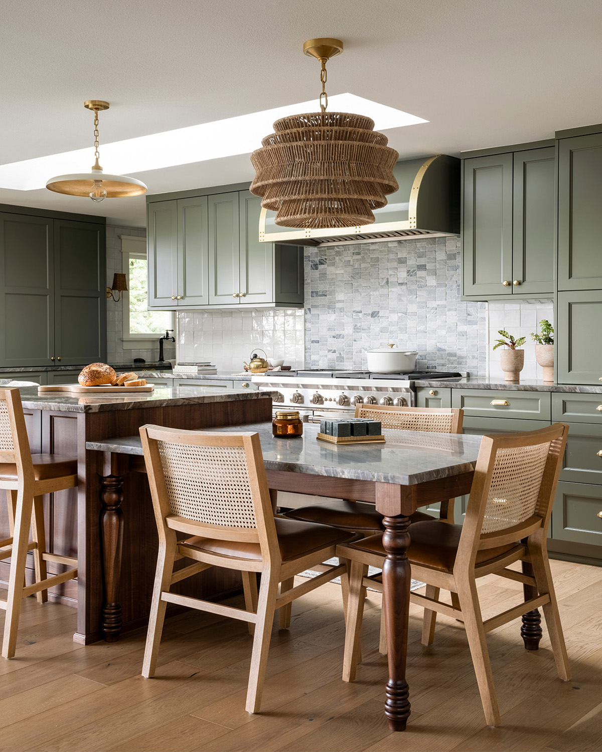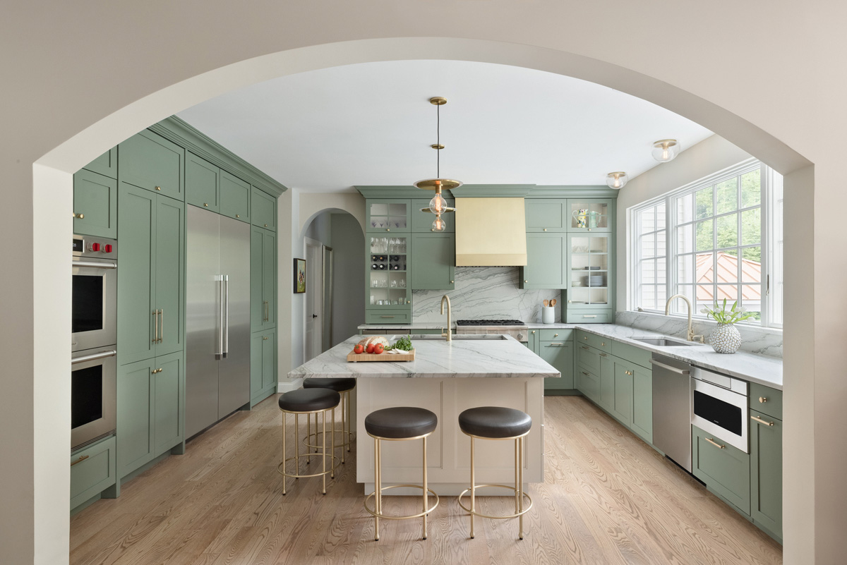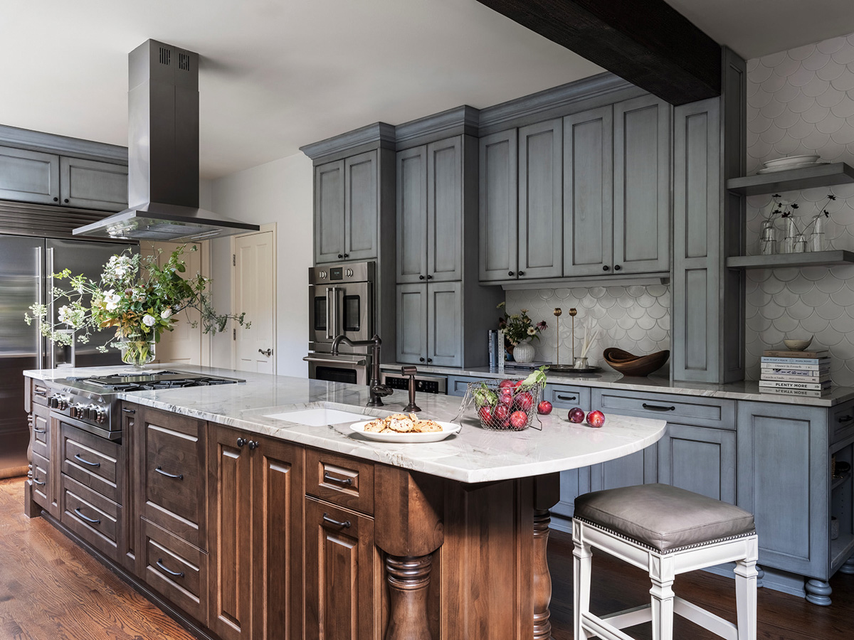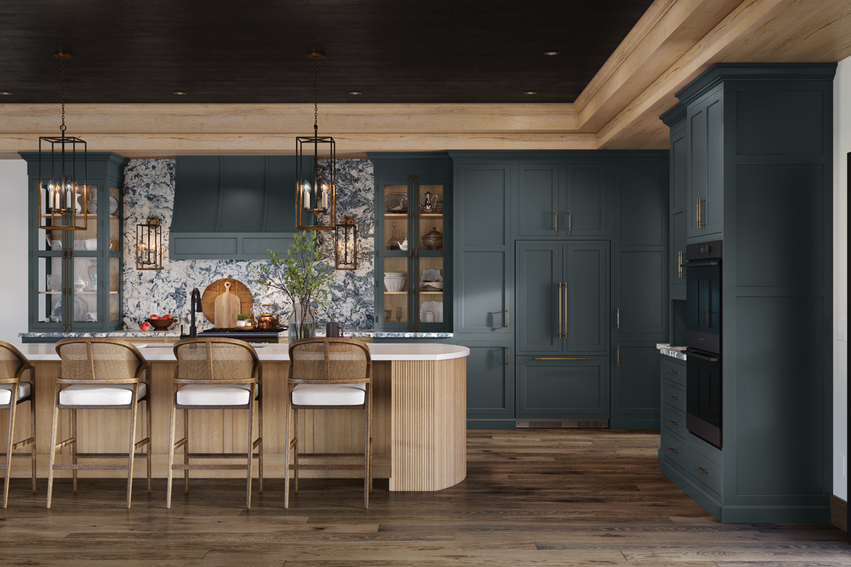 “After nearly a decade of white shaker cabinets being the default choice for homeowners, we’re seeing this field begin to open up,” she states. “[Now] when white cabinets are incorporated, they’re often mixed with other finishes, including mid-tone woods and shades of blue and green, the two most popular color families for cabinetry.