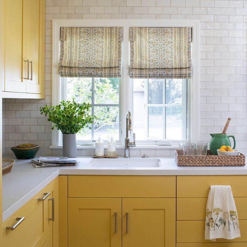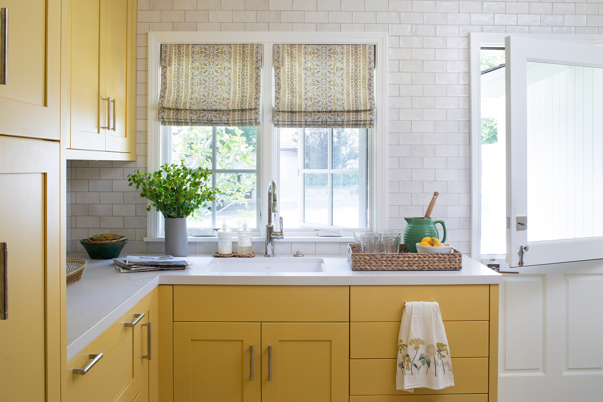 The main kitchen in this home is layered in various shades of neutral hues. To satisfy her client’s desire for some added color, Caren Rideau selected Benjamin Moore’s Marblehead Gold, a versatile shade of straw with muted amber undertones, for the cabinetry in the adjacent larder.