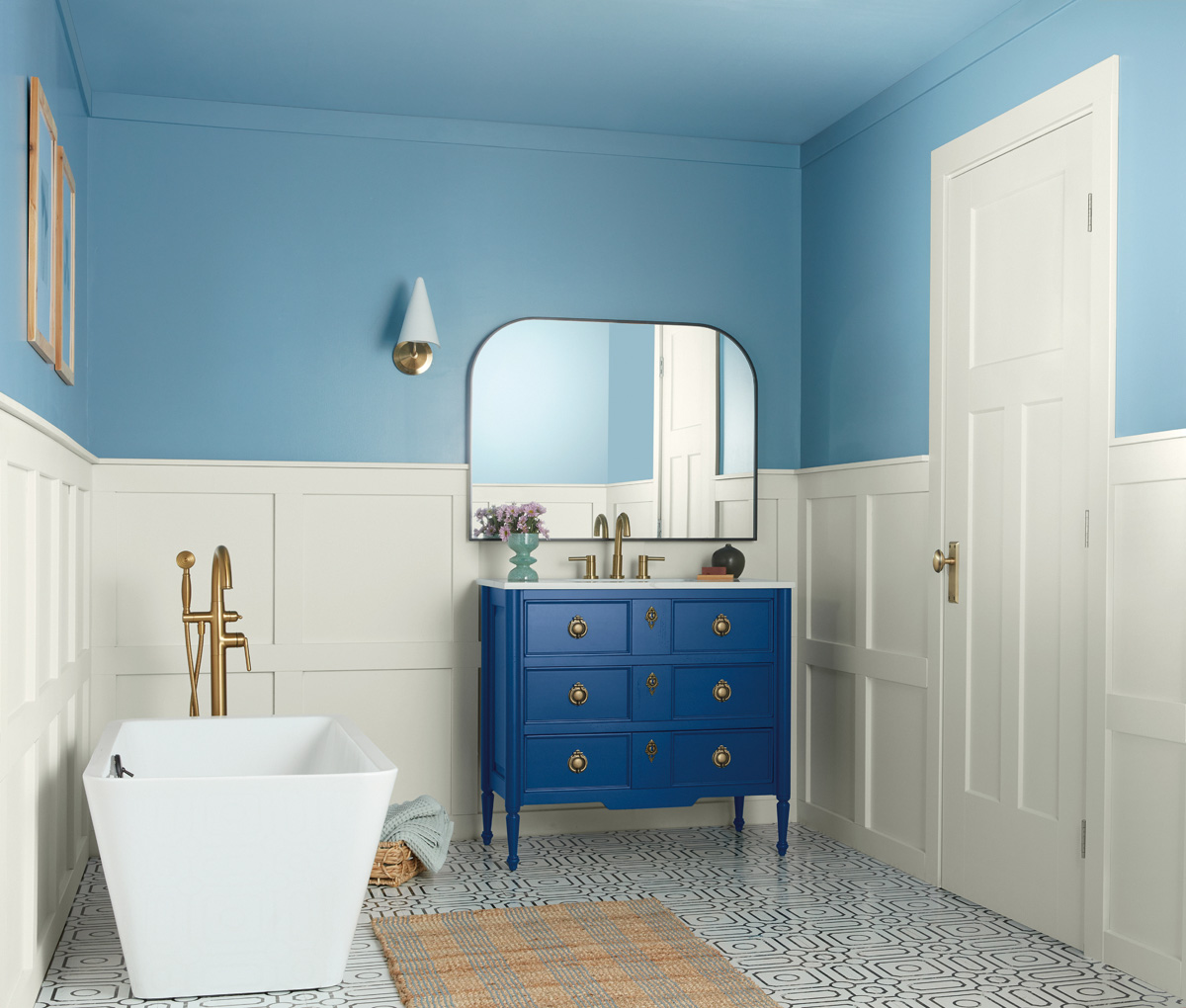 “For those who like to play with more color, blue and green are popular choices for a kitchen or bathroom because they are pulled from nature and help ground these hardworking spaces,” she continues. “The wellness trends are still important in our home life, too, so colors that embody or support comfort and a nurturing mood take center stage. Kitchen colors are getting lighter when paired with material in their raw state, like wood. On the other hand, the bathroom is getting moody with layers that help create a hotel spa-like ambiance. A color like Encore is versatile because it can fit into both spaces.”